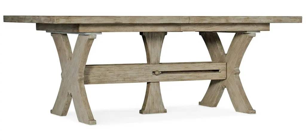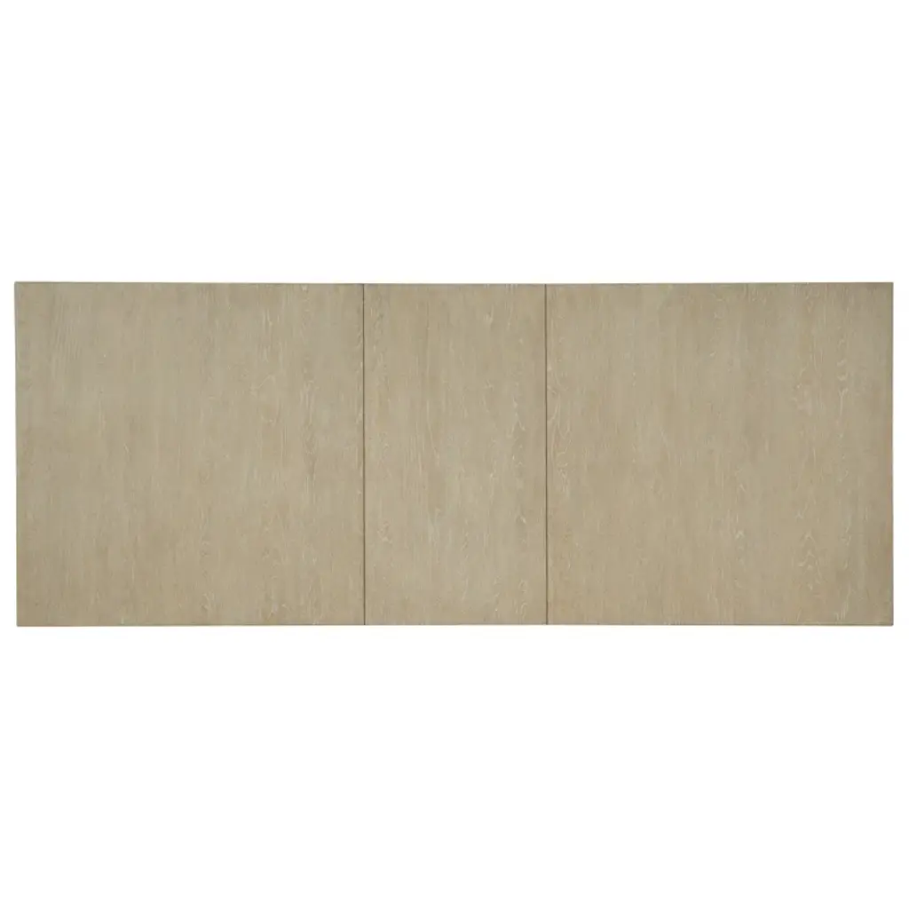 Linger for memorable meals with family and friends at this inviting modern farmhouse-style table that offers a retreat from your fast-paced lifestyle. Crafted of oak veneers, the Cascade rectangle dining table features a stretcher that joins the 2-pedestal base, with the entire base finished in a creamy-colored textured gesso with crackle. The tabletop is a soft taupe finish on oak veneers with dry brushing. With one 22-inch leaf, the table extends to 106 inches long, accommodating 2 armchairs and 6 side chairs. Designed to interject a sense of calm and tranquility into interior spaces, the Cascade Collection creates an elegant - yet livable Ð retreat from our modern-day, fast-paced lifestyles. Characterized by its light and airy neutral color palette and use of mixed materials including oak, lacquered burlap, metal accents and champagne-tone hardware, the collection's modern styling can easily find its way into a variety of interiors across the country. As soothing as water falling from a steep rocky slope, the Cascade Collection was designed to spark Zen, tranquility, and calmness in any living space.