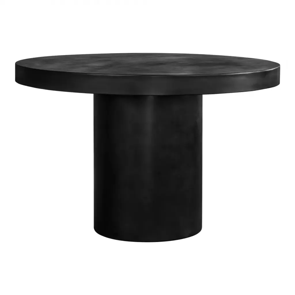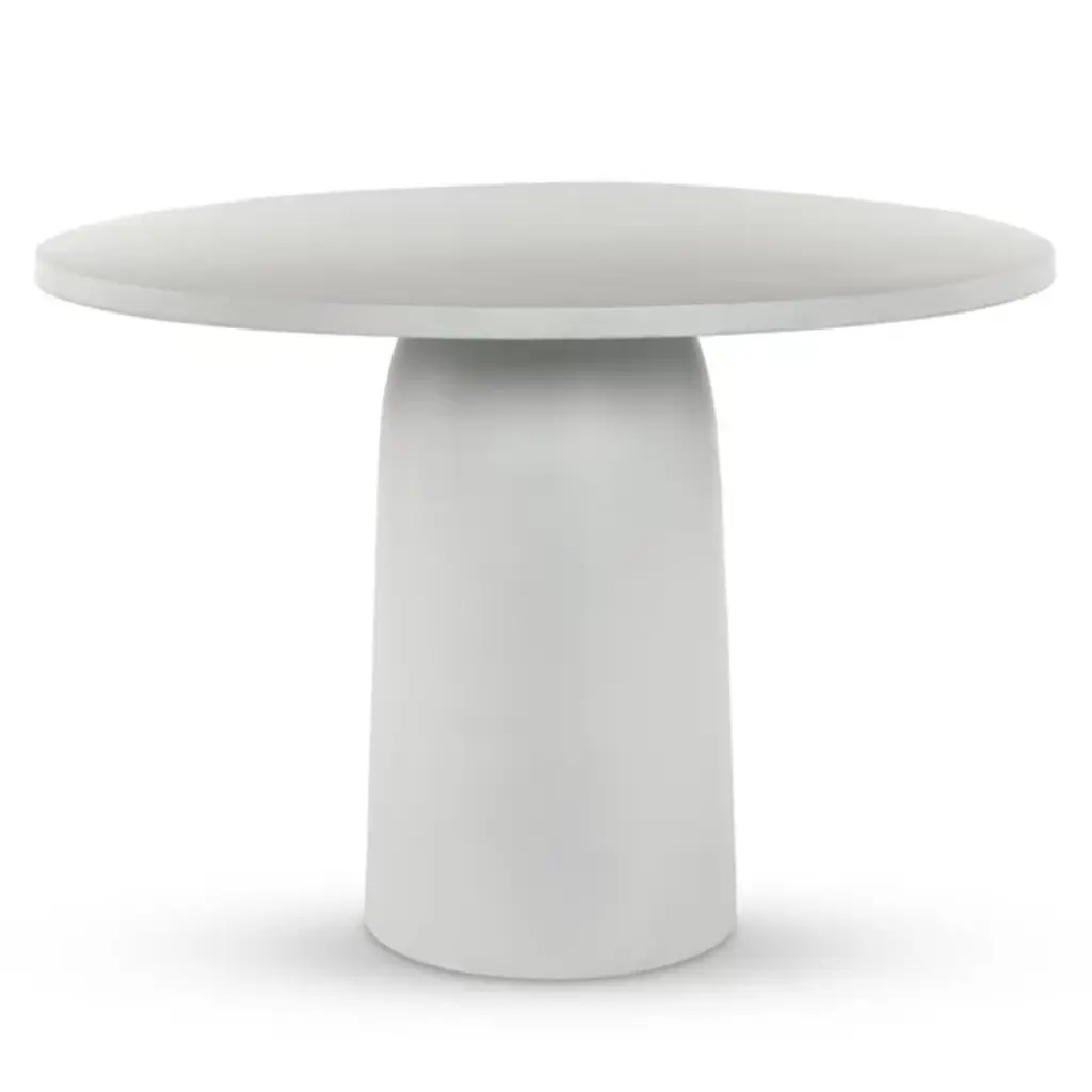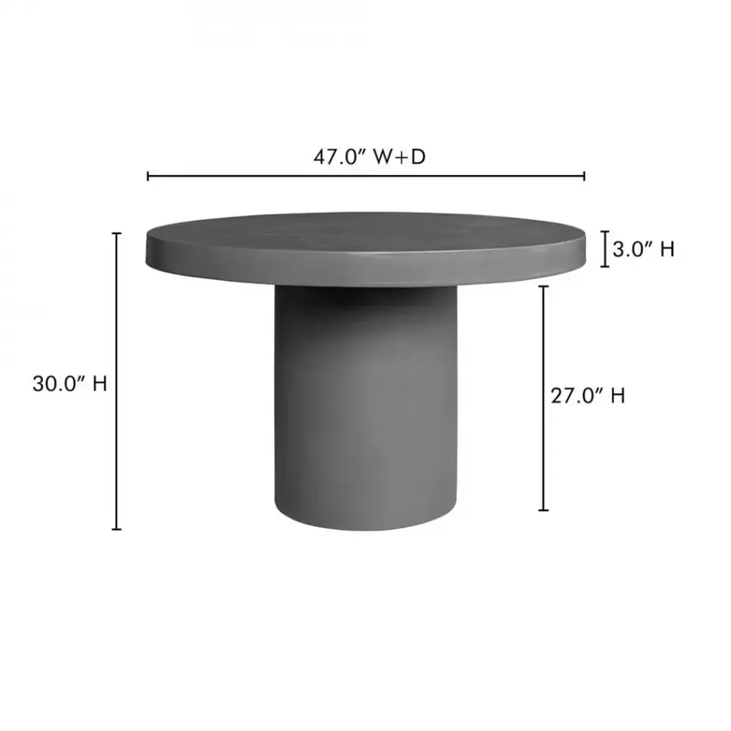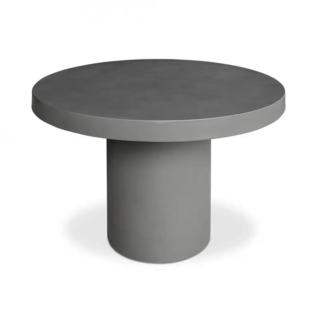 Keen on concrete to bring the outdoors a little closer. A hard material for softer contrast, the Cassius outdoor patio table is the perfect transitional piece for alfresco living. Both durable and eye-catching, this round pedestal table is made from fiber-reinforced concrete that helps to prevent cracking. Here to give your outdoor dining area a sleek, modern look with a hefty pillared base and a thick, matte, circular tabletop. Ideal for any garden or patio setting, this dining table works indoors as well as a stately, contemporary design.