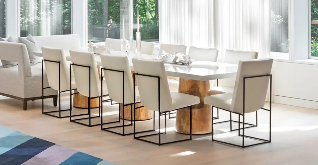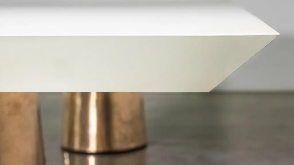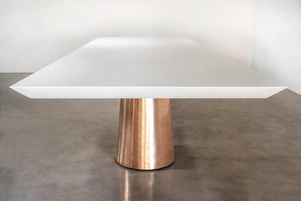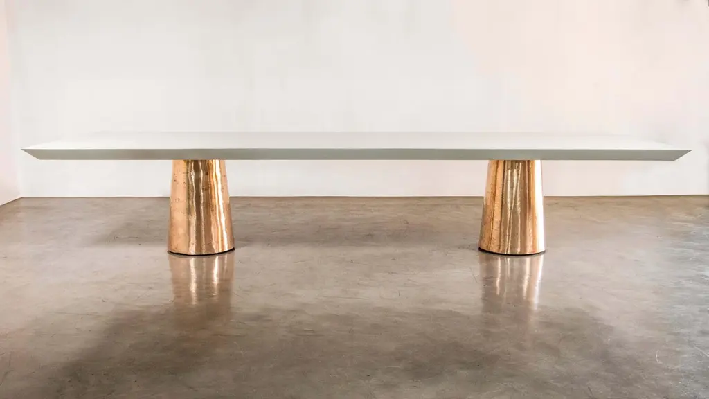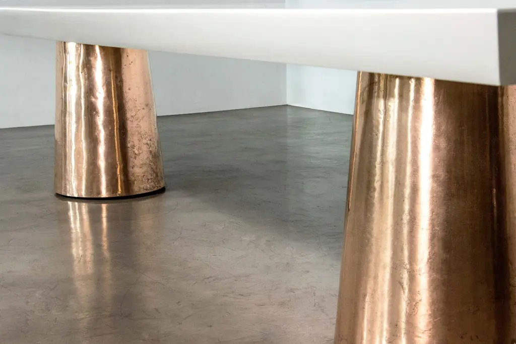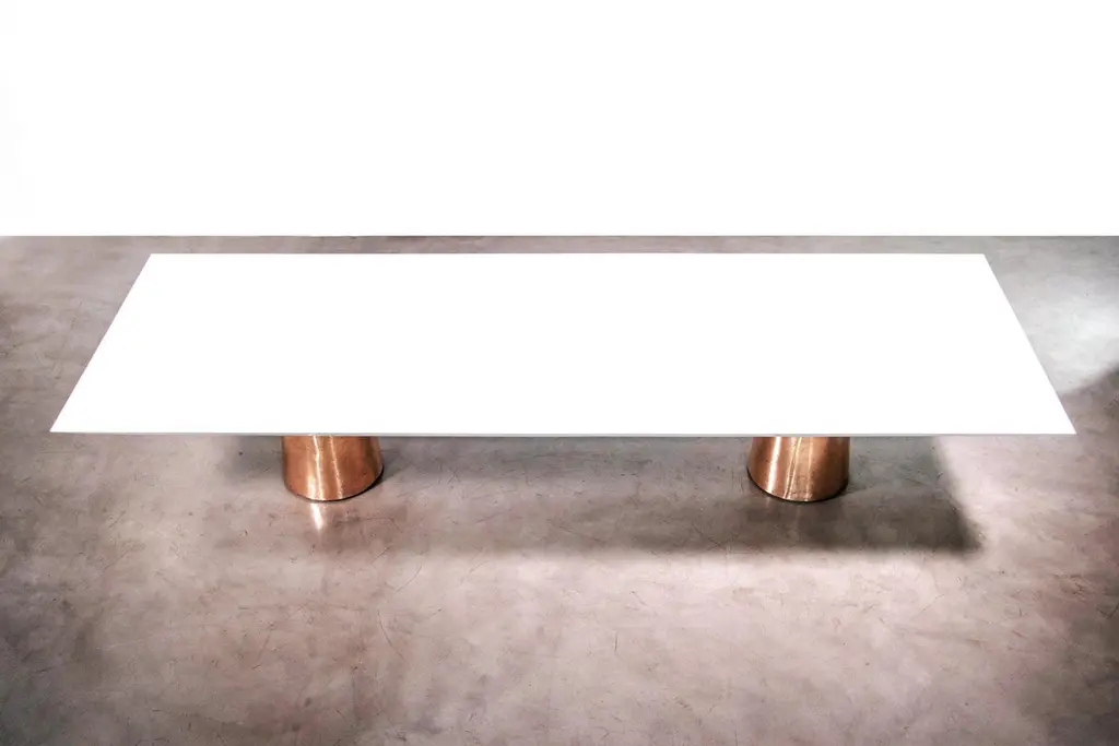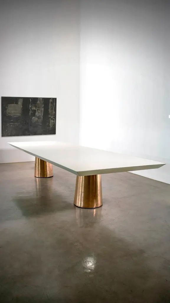 The Benino Table features two polished cast bronze bases with a lacquered wood with knife edge top. Available also in stone or natural wood top, and in any size or finish. Measurements are: 156" L x 54" W x 30" H as shown but may be made in the size and shape of your choice. Other materials available are Argentine Rosewood, Oak, Walnut, Maple, Cherry, Beech, Elm, Okume, Teak, African Teak, Black Maple, Bubinga, Cerused Oak, Cerused Gray Oak, Gray Oak, Ebony, Macassar Ebony, Striped Macassar Ebony, Walnut Burl, Sycamore, and Zebrawood. Available in matte, semi-gloss, high gloss finish or lacquered.About Costantini DesignCostantini has been a trusted source for custom furniture, objects and lighting for a global client base since 2002. Its founder and owner, William Stuart, is a designer and artist who began his career as a multimedia artist and sculptor, practices which continue to inform the work. With a studio showroom in New York and a team of artisans at their own workshop in Buenos Aires, the Costantini team is able to connect artisans and artists with acclaimed clientele around the world. Its artisans work across many disparate materials such as bronze, solid wood, fiberglass, steel, plaster, goatskin, leather, rush, iron, marble, sheepskin and more. Visit their New York or Buenos Aires locations by appointment.