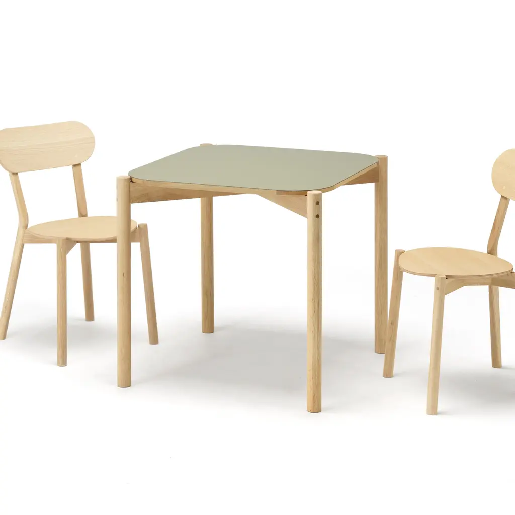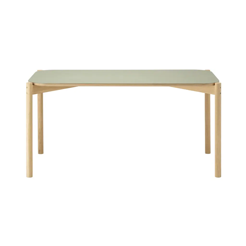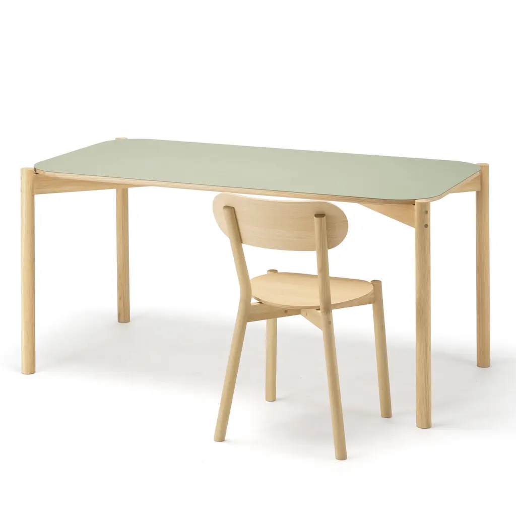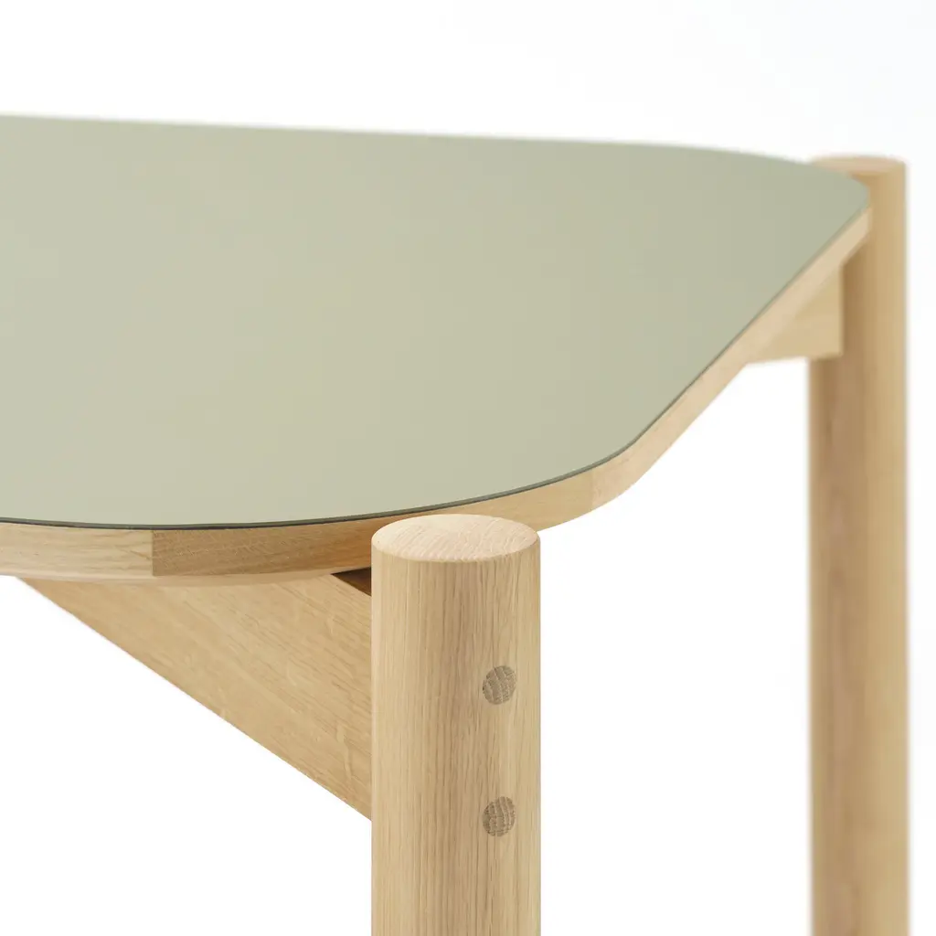 With its rounded tabletop framed by wooden legs, a version in matte green linoleum adds a warm touch and durable elegance to Karimoku New Standard's classic Castor series, designed by acclaimed Swiss studio Big-Game. Fashioned in solid, sustainably sourced Japanese oak, the table comes in 3 sizes and is light and compactand the linoleum surface makes it particularly suitable for use in a home office or as carefree dining table.