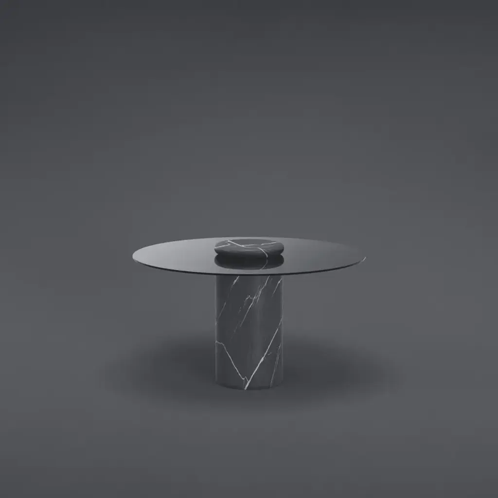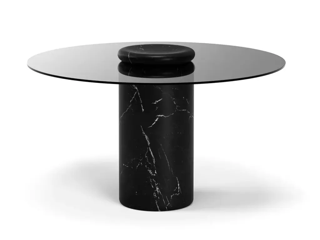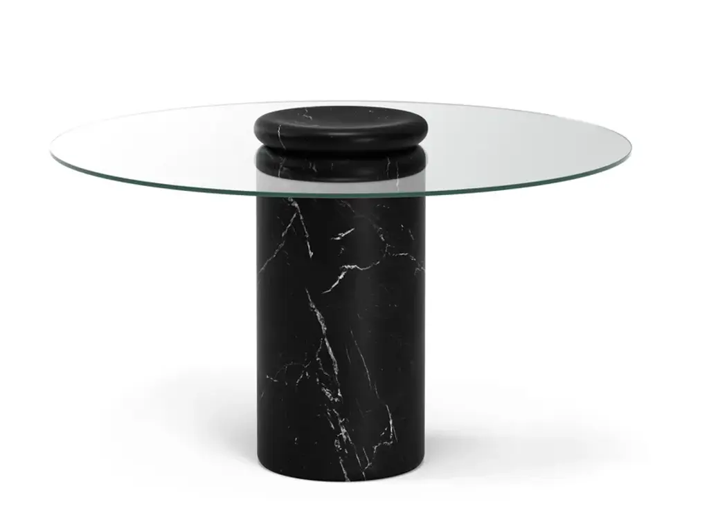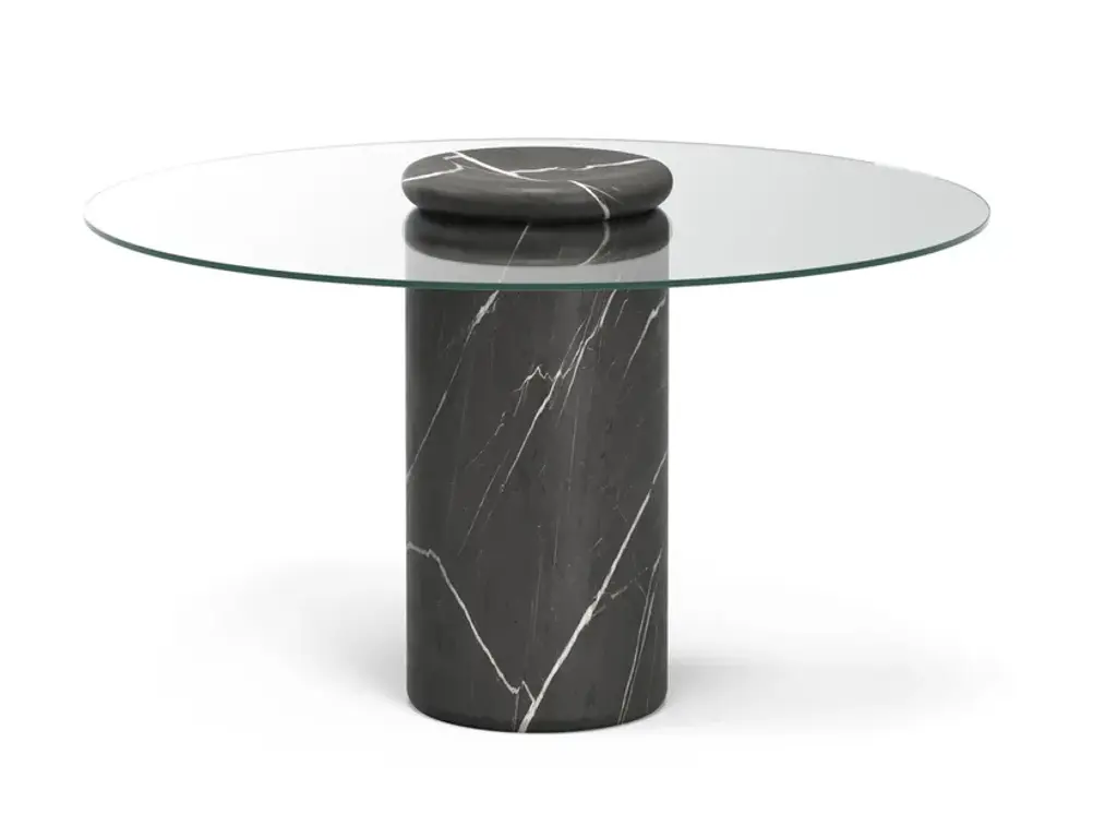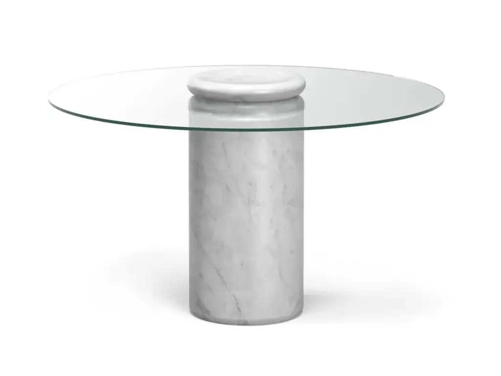 Castore is a glass and marble table by Italian architect, sculptor and designer Angelo Mangiarotti. Designed in 1975 for Sorgente dei Mobili, the distinct design is now presented by Karakter, available as a 130cm dining table.The round glass top rests on a heavy marble pillar, and visually, Mangiarotti would have it seem that only a small marble bowl on top of the glass plate is holding it in place. The rounded corners on both the pillar and the bowl ads a sense of softness to the otherwise heavy aesthetics of the marble.The marble bowl can be removed and used as an individual element. However, keeping it as an integral part of the design, you can enjoy additional rounded corners, as the bowl reflects in the glass table top.Material:Pillar and bowl in marble, table top in 10mm tempered glass, felt underneath the pillar, cork underneath the bowl.Finish:Marbles: Bianco Carrara, Nero Marquina or Pietra GreyGlass: Clear or smoked