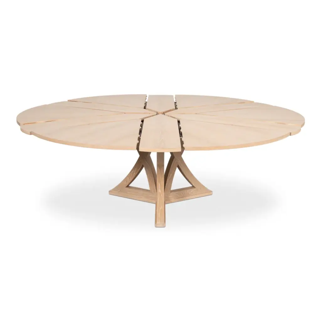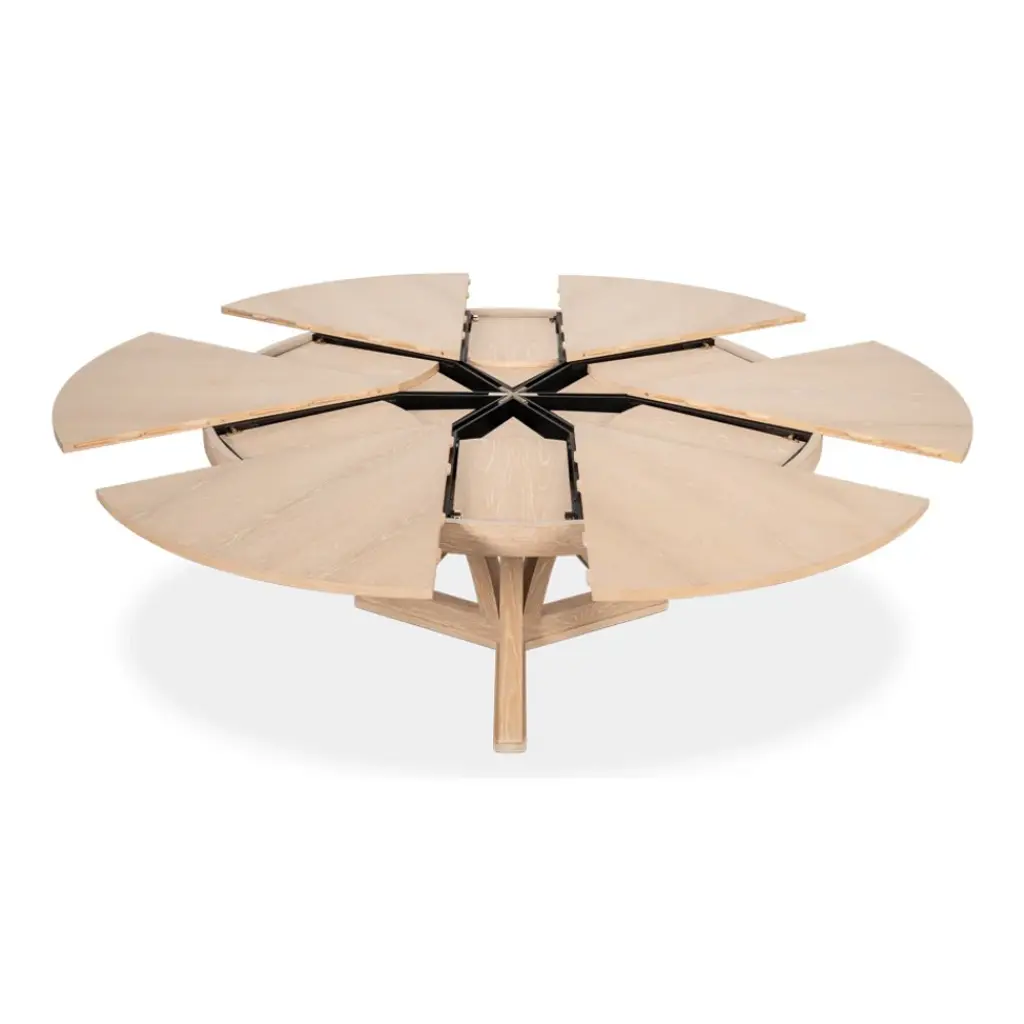 Our new and improved Jupe table is made with updated materials that add strength + durability, yet offer ease of expansion. As your guest list grows, so can your table. Masterful engineering allows this round Jupe dining table to adjust the size while concealing the leaves within. Transitional styling coupled with a working white finish provides everlasting versatility. Everything about this table is head-turning, even its undulated shape when in an open position. Simply stunning!