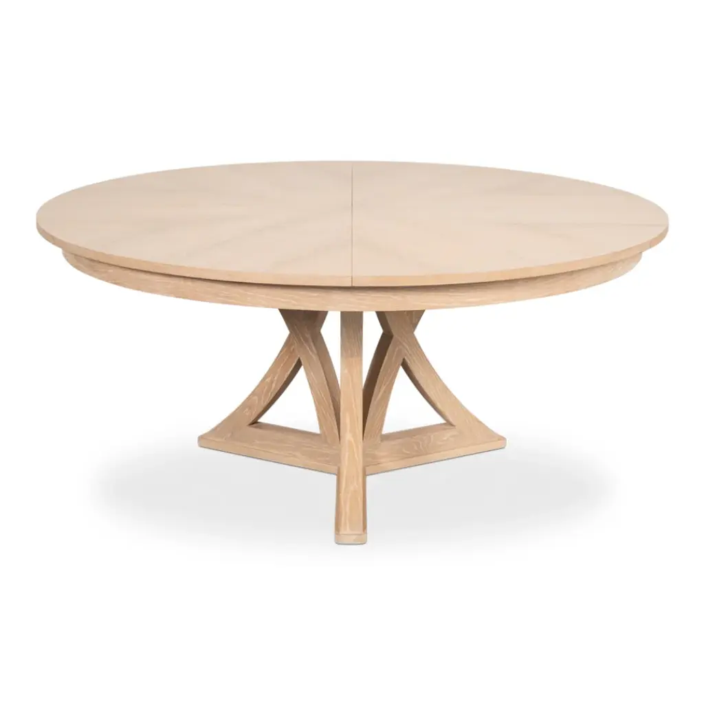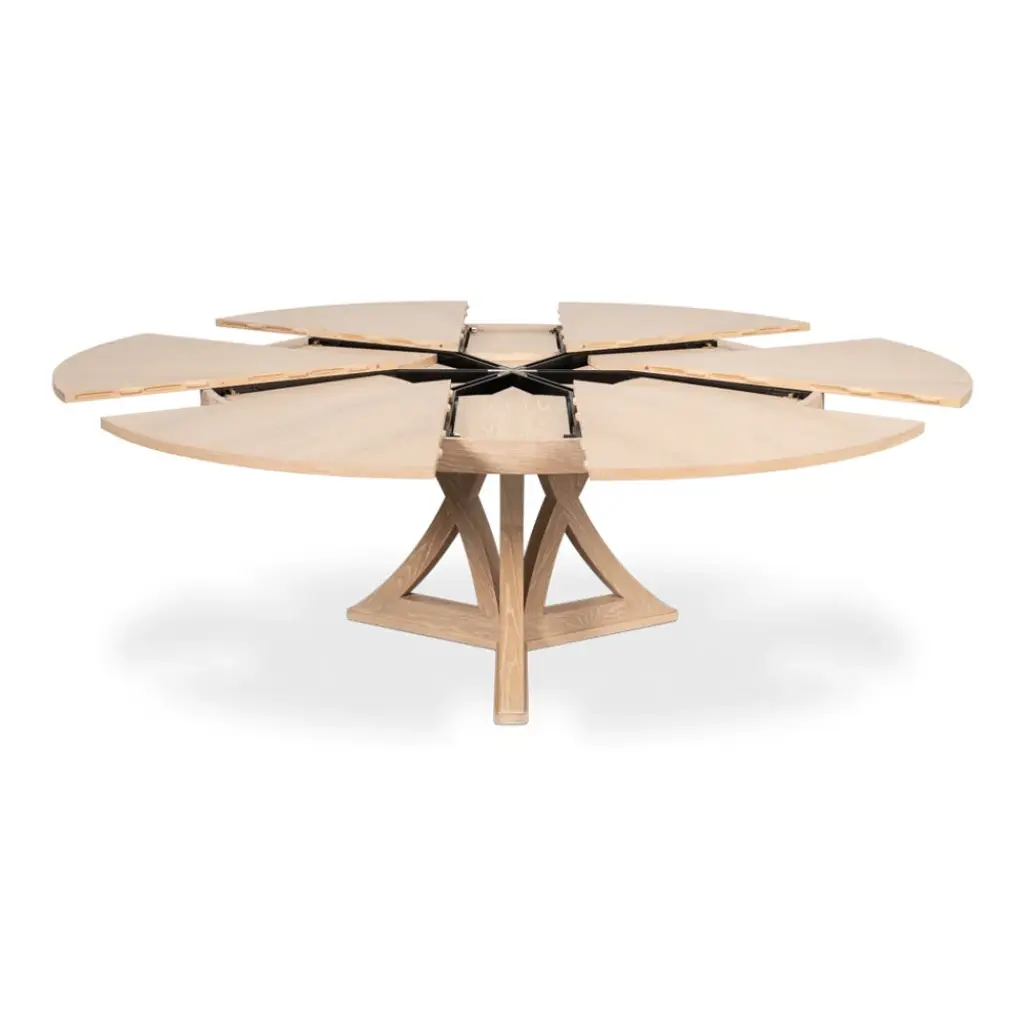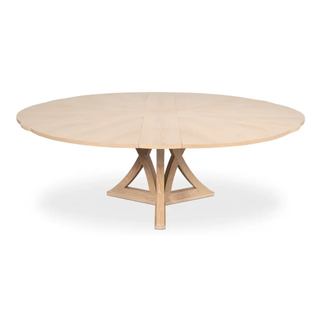 Our new and improved Jupe table is made with updated materials that add strength + durability, yet offer ease of expansion. As your guest list grows, so can your table. Masterful engineering allows this round Jupe dining table to adjust the size while concealing the leaves within. Transitional styling coupled with a working white finish provides everlasting versatility. Everything about this table is head-turning, even its undulated shape when in an open position. Simply stunning!