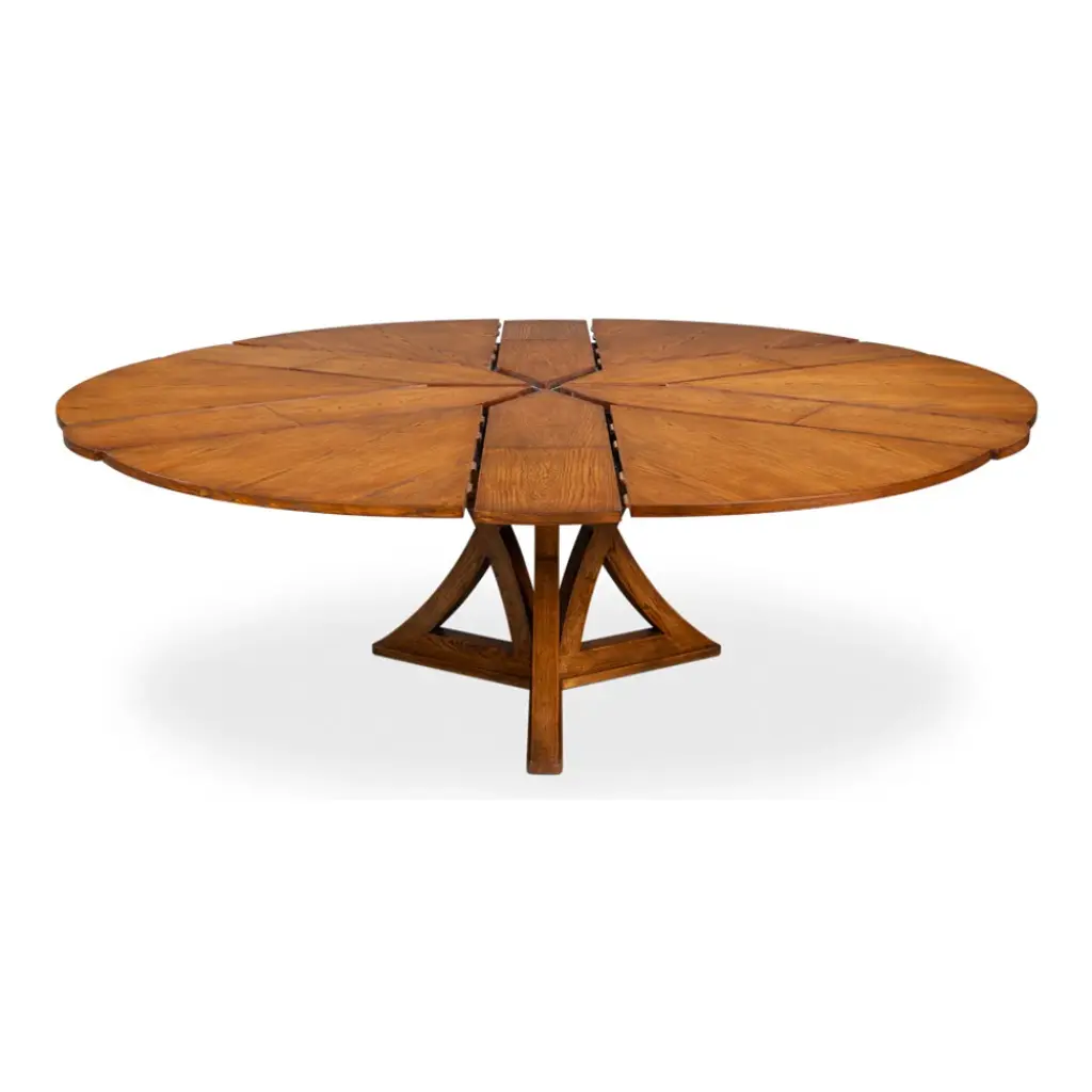 Elevate your dining experience with the solid wood round dining table by Sarreid Ltd. Furniture, a timeless centerpiece designed to grow with your gatherings. Our new and improved Jupe table is made with updated materials that add strength + durability, yet offer ease of expansion. Crafted from solid walnut and Paldao veneers, this exquisite Jupe dining table combines expert craftsmanship with modern engineering, offering both style and function in one beautifully constructed piece. Inspired by 19th-century innovation and reimagined for contemporary homes, this Jupe expanding round table features Sarreid's newly reengineered, self-storing expansion mechanism made from durable extruded aluminum. This smooth, effortless system allows you to expand the table from 55" to 71" in diameter, seamlessly accommodating up to 8 guests. When open, the Casual Jupe Table’s undulated edge adds visual intrigue and organic elegance. Whether you're hosting a formal dinner or a casual brunch, the versatile solid wood round Jupe dining room table adapts with ease. The dark walnut finish and sleek geometric pedestal base offer a sophisticated yet transitional style that complements a range of interiors, from classic to modern.