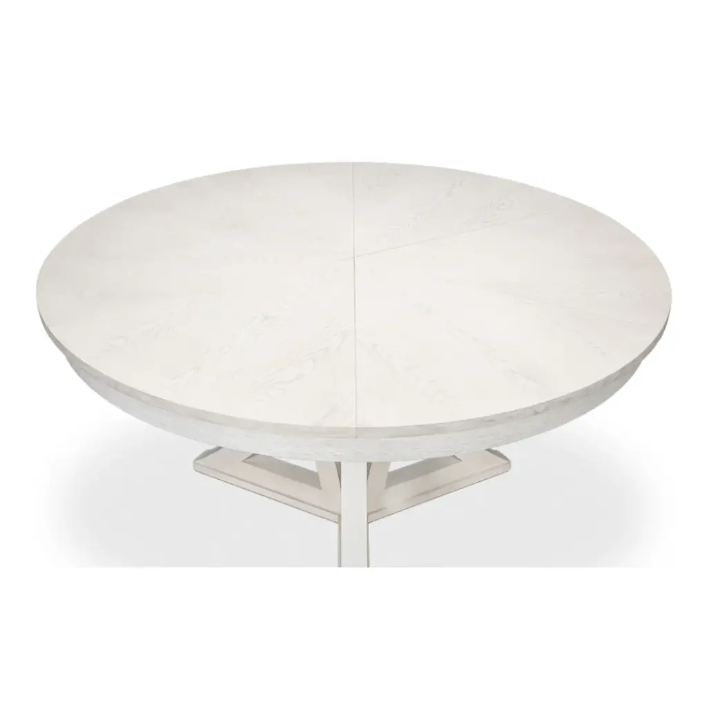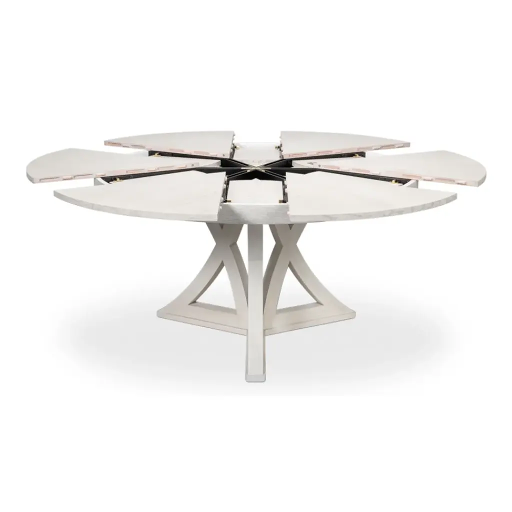 Our new and improved Jupe table is made with updated materials that add strength + durability, yet offer ease of expansion. As your guest list grows, so can your table. Masterful engineering allows this round dining table to adjust the size while concealing the leaves within. Transitional styling coupled with a rich light mink finish provides everlasting versatility. Everything about this table is head-turning, even its undulated shape when in an open position. Simply stunning!