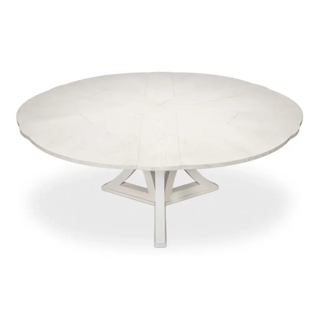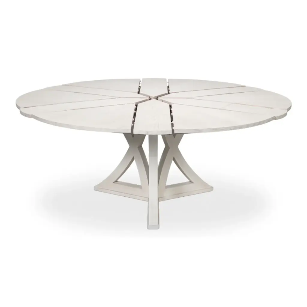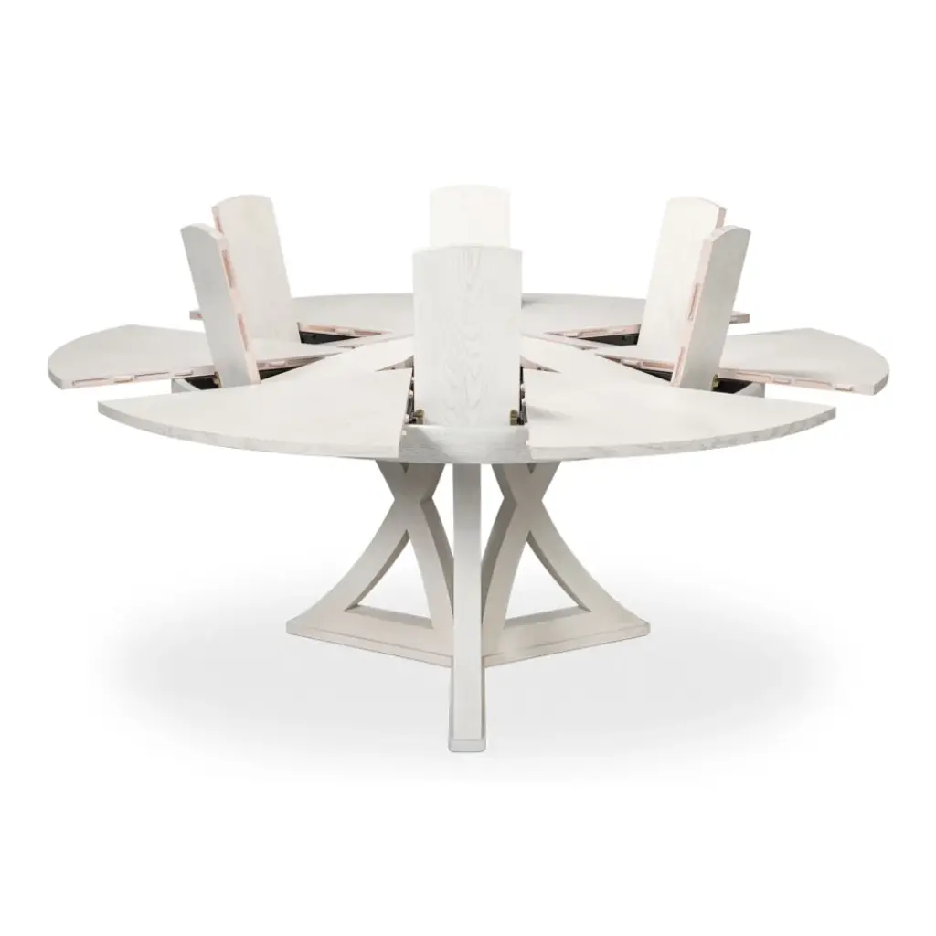 Our new and improved Jupe table is made with updated materials that add strength + durability, yet offer ease of expansion. As your guest list grows, so can your table. Masterful engineering allows this round Jupe dining table to adjust the size while concealing the leaves within. Transitional styling coupled with a working white finish provides everlasting versatility. Everything about this table is head-turning, even its undulated shape when in an open position. Simply stunning!