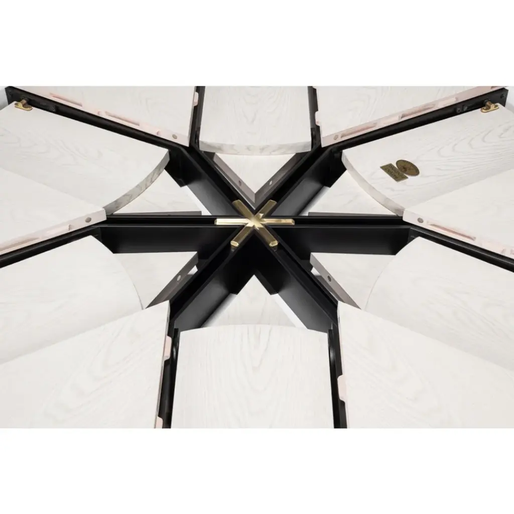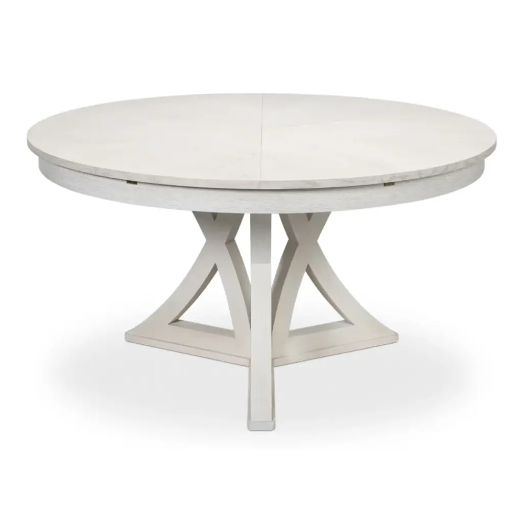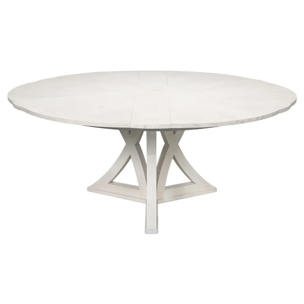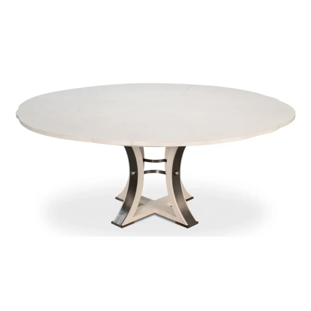 Our new and improved Jupe table is made with updated materials that add strength + durability, yet offer ease of expansion. As your guest list grows, so can your table. Masterful engineering allows this round Jupe dining table to adjust the size while concealing the leaves within. Transitional styling coupled with a working white finish provides everlasting versatility. Everything about this table is head-turning, even its undulated shape when in an open position. Simply stunning!