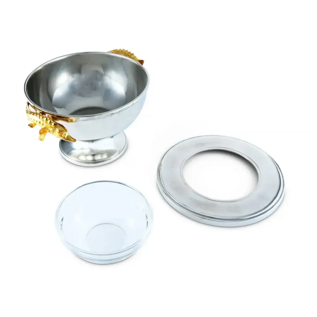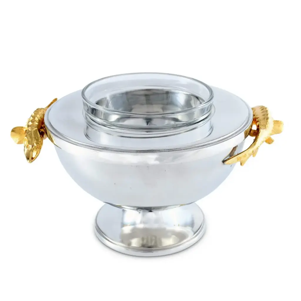 Complement your fine gourmet accessories with our caviar server exclusively designed at Vagabond House. Handcrafted in pewter and crystal glass, the set is made with intricate details and high standards to last a lifetime. A dazzling and functional piece. The caviar serving set levels up the caviar tasting experience. Add ice to the cocktail chiller bowl, put the crystal bowl on top, serve the roe and secure using the top ring, the set close neatly, and adds an exquisite accent to the dining table decor. Vagabond House is a family-owned American company specializing in fine pewter tableware, servingware and giftware. Largely inspired by nature, their exclusive products are designed to be unique, functional heirlooms for those who seek to express tradition and style in both family and formal entertaining.