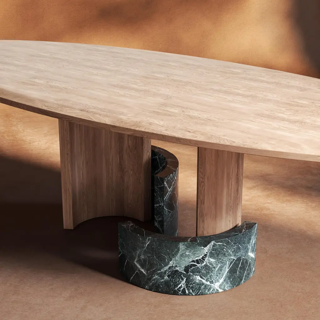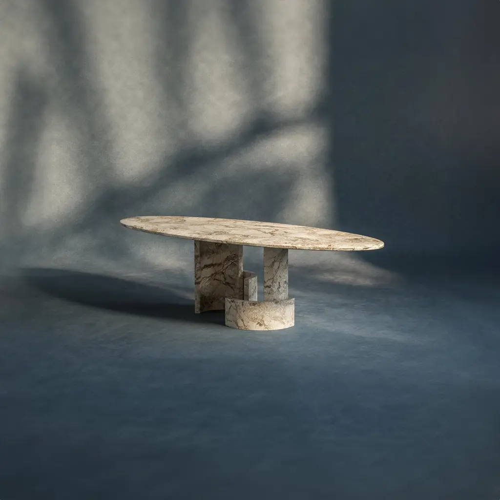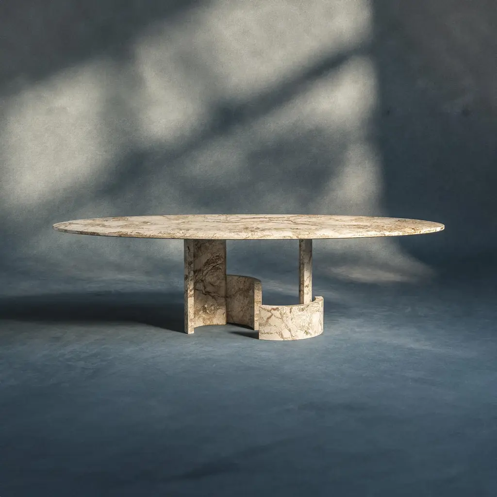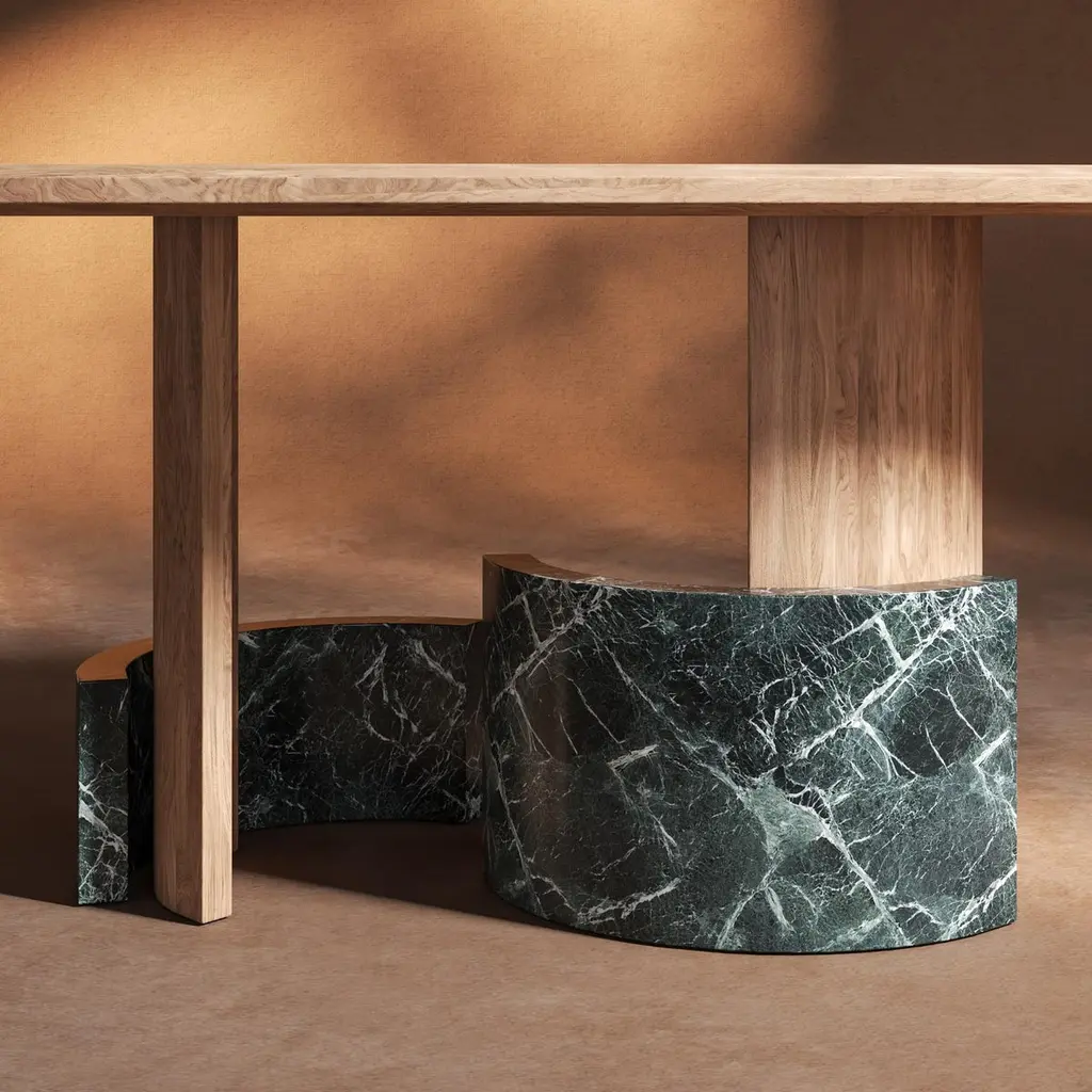 🖤 A Sculptural Statement in Stone and Wood by dAM AtelierThis striking piece from DAM Atelier is more than furniture—it’s an architectural composition rendered in stone and wood. With a bold, sculptural presence, it explores the expressive potential of form through the juxtaposition of semicircular elements, each subtly rotated to create a rhythmic landscape of staggered levels. These interlocking volumes are not merely decorative—they are essential to the structural logic of the piece, embodying a harmony between function and form.The design is anchored by an exquisitely carved selection of materials, where cool, veined marble meets the warmth of finely finished wood. This tactile contrast enhances the visual depth and invites closer inspection, revealing the craftsmanship behind every curve and contour. The tabletop, crafted from a single material, crowns the composition with quiet elegance—its smooth surface amplifying the softness of the silhouette while unifying the diverse elements beneath.Every angle reveals a new perspective, making this piece a living sculpture that transforms its surroundings. Ideal for collectors, architects, and design aficionados, it stands as a testament to DAM Atelier’s commitment to bold design, material excellence, and architectural storytelling.