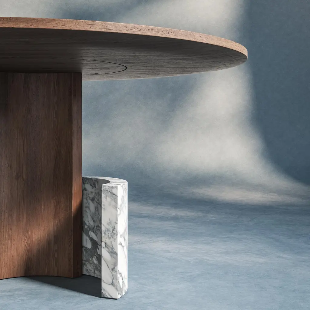 🖤 A Sculptural Statement in Stone and Wood by dAM AtelierThis striking piece from DAM Atelier is more than furniture—it’s an architectural composition rendered in stone and wood. With a bold, sculptural presence, it explores the expressive potential of form through the juxtaposition of semicircular elements, each subtly rotated to create a rhythmic landscape of staggered levels. These interlocking volumes are not merely decorative—they are essential to the structural logic of the piece, embodying a harmony between function and form.The design is anchored by an exquisitely carved selection of materials, where cool, veined marble meets the warmth of finely finished wood. This tactile contrast enhances the visual depth and invites closer inspection, revealing the craftsmanship behind every curve and contour. The tabletop, crafted from a single material, crowns the composition with quiet elegance—its smooth surface amplifying the softness of the silhouette while unifying the diverse elements beneath.Every angle reveals a new perspective, making this piece a living sculpture that transforms its surroundings. Ideal for collectors, architects, and design aficionados, it stands as a testament to DAM Atelier’s commitment to bold design, material excellence, and architectural storytelling.