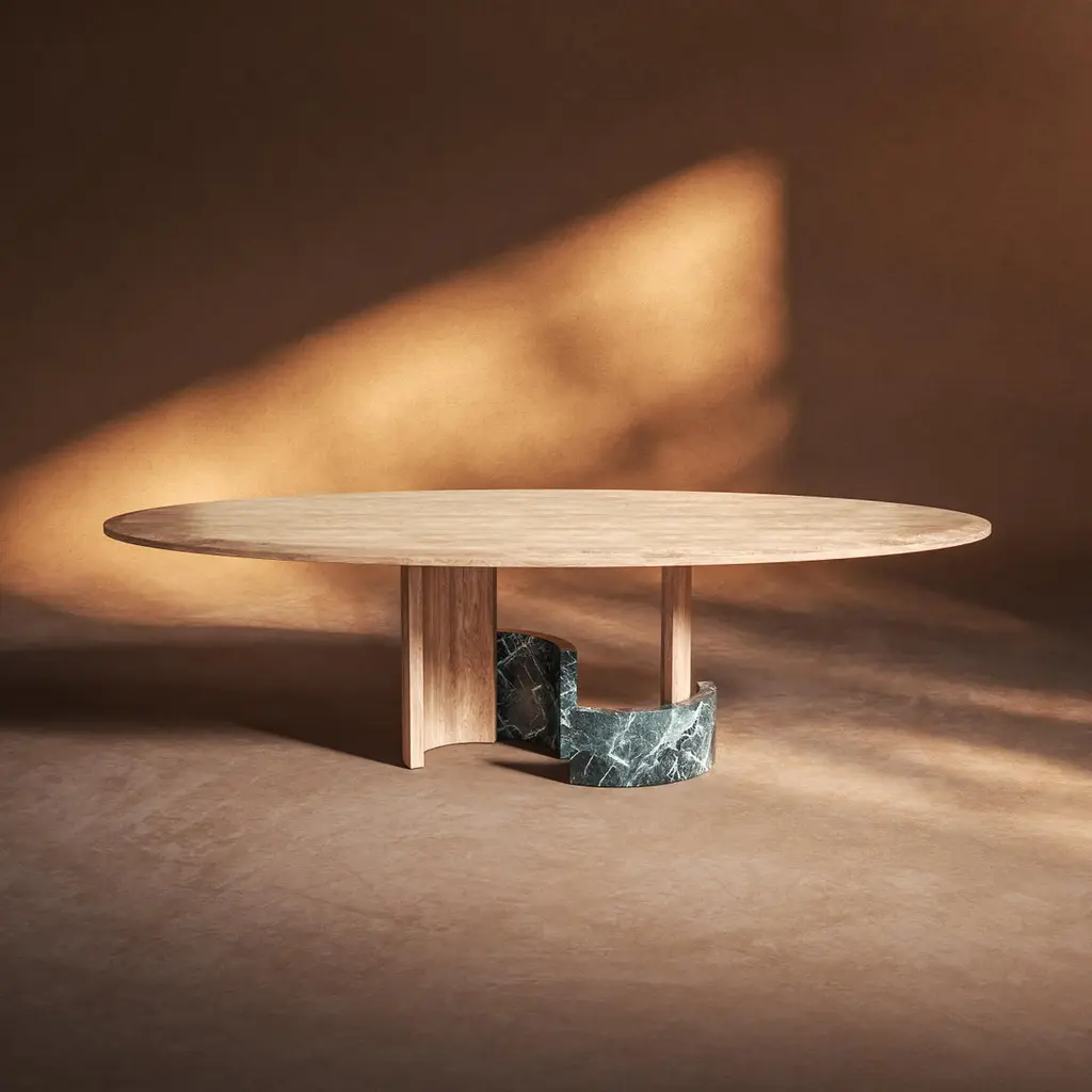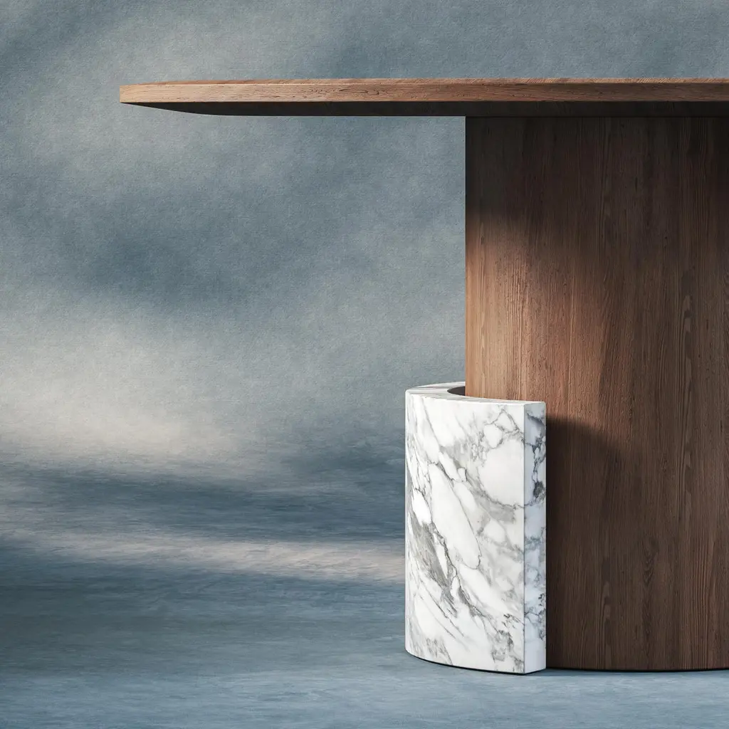 🖤 A Sculptural Statement in Stone and Wood by dAM AtelierThis striking piece from DAM Atelier is more than furniture—it’s an architectural composition rendered in stone. With a bold, sculptural presence, it explores the expressive potential of form through the juxtaposition of semicircular elements, each subtly rotated to create a rhythmic landscape of staggered levels. These interlocking volumes are not merely decorative—they are essential to the structural logic of the piece, embodying a harmony between function and form.The design is anchored by an exquisitely carved selection of materials. This tactile contrast enhances the visual depth and invites closer inspection, revealing the craftsmanship behind every curve and contour. The tabletop, crafted from a single material, crowns the composition with quiet elegance—its smooth surface amplifying the softness of the silhouette while unifying the diverse elements beneath.Every angle reveals a new perspective, making this piece a living sculpture that transforms its surroundings. Ideal for collectors, architects, and design aficionados, it stands as a testament to DAM Atelier’s commitment to bold design, material excellence, and architectural storytelling.