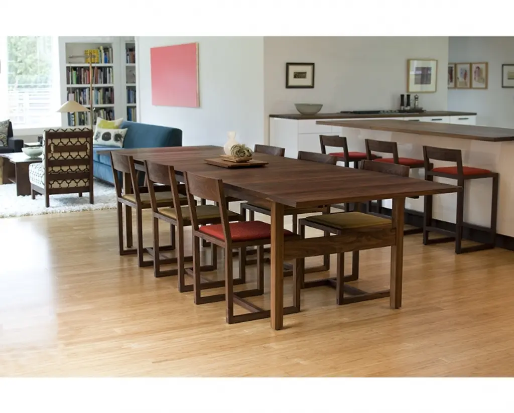 The Celilo dining table is a classic trestle table design with inset square legs and trestle, allowing for ample room to sit someone at the end of the table. Available in extension or solid-top, this design pairs beautifully with the modern Celilo dining chair.