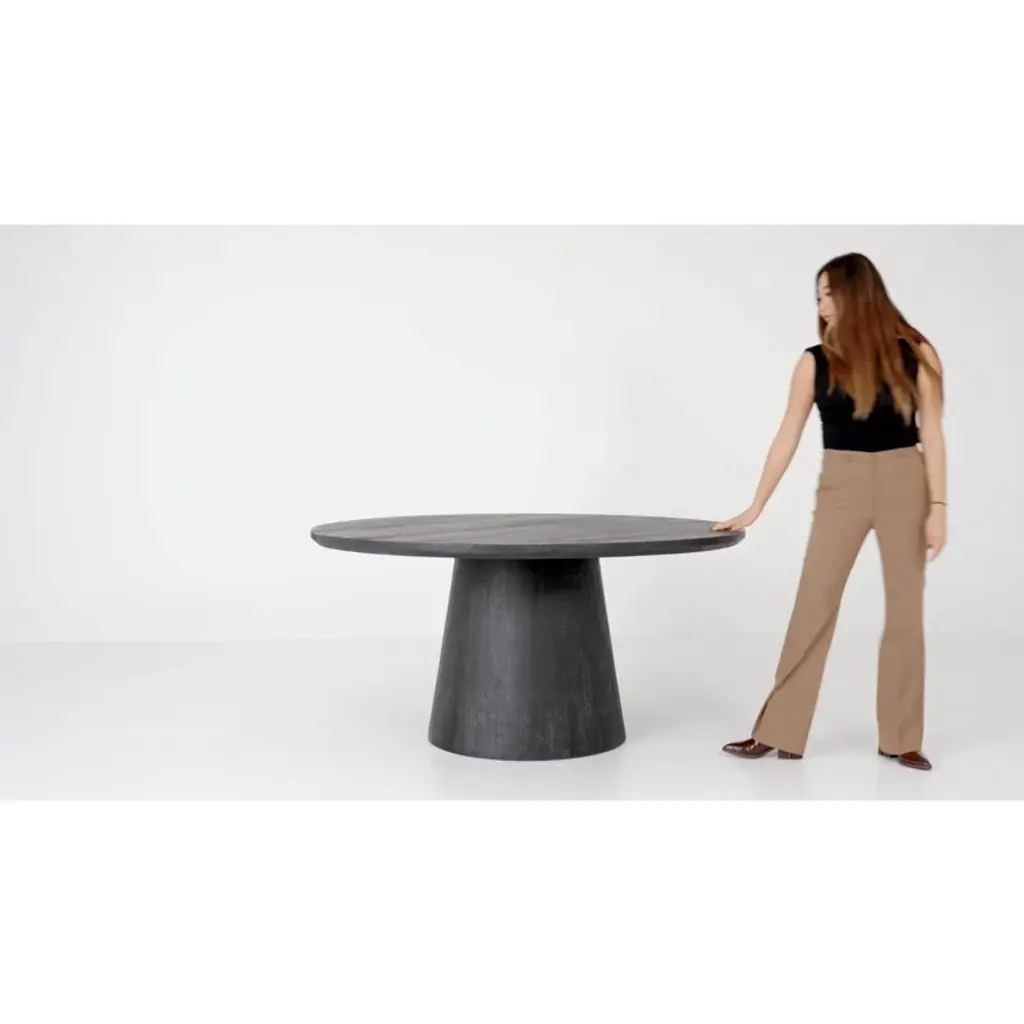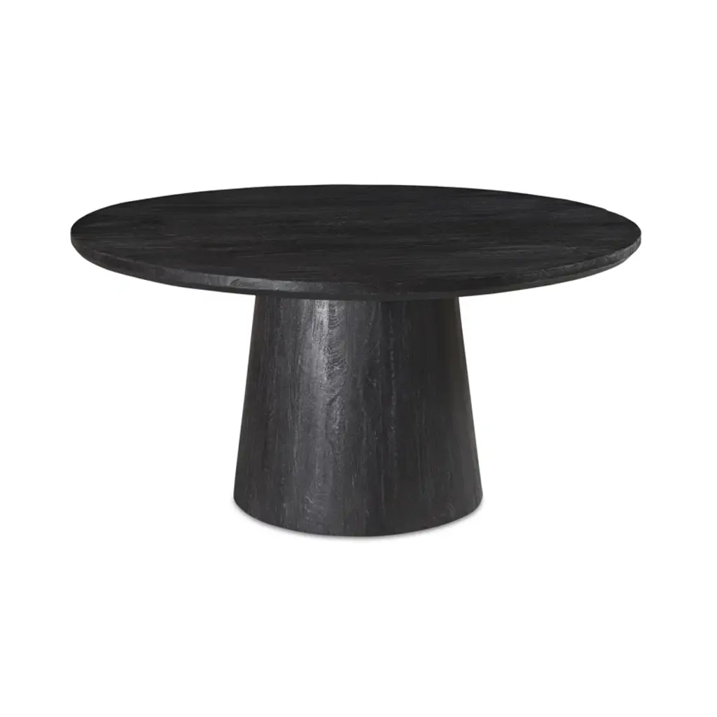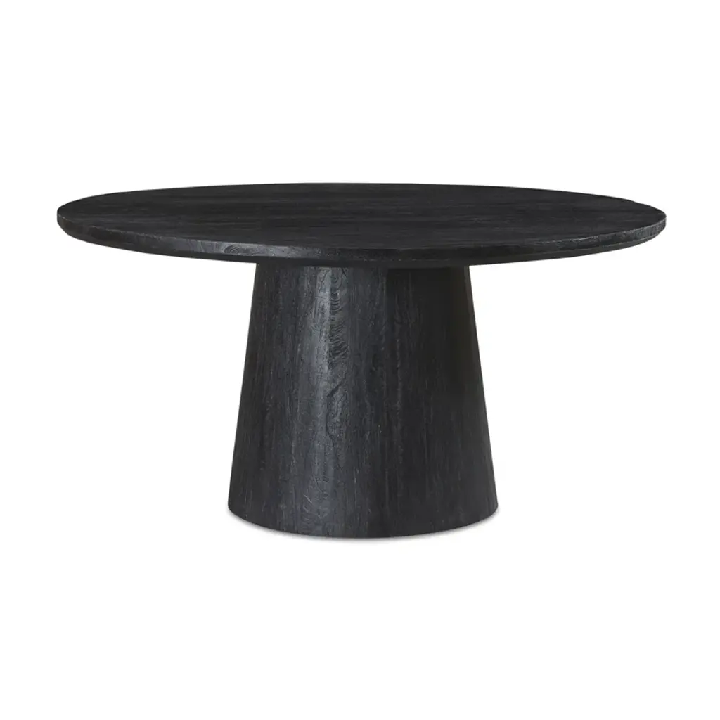 Bold in black with a sandblasted, cerused finish that accentuates the natural wood grain, the Cember dining table adds organic appeal and dramatic presence to any condo or smaller living space. A natural expression of modern rustic style, this piece features an oversized drum-shaped, tapered pedestal base, a solid foundation to a stately silhouette.