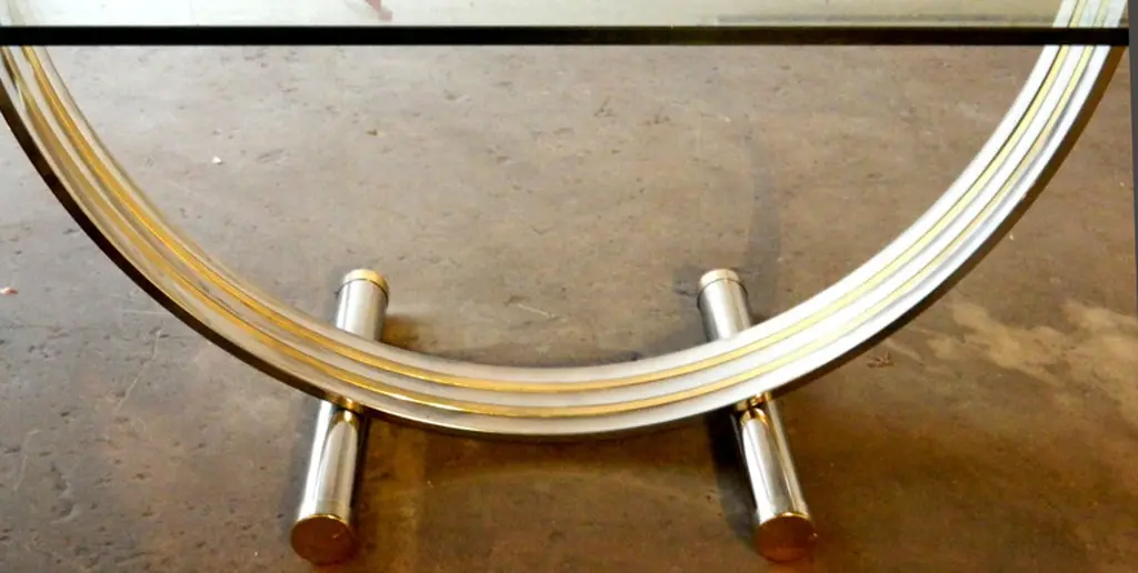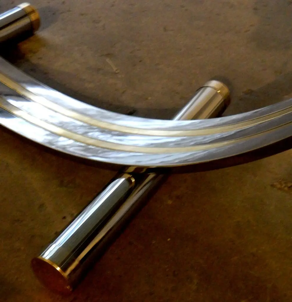 Very elegant Romeo Rega harp shaped chrome and brass base centre table, console or dining table.Pair Available