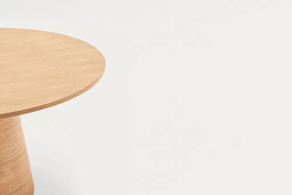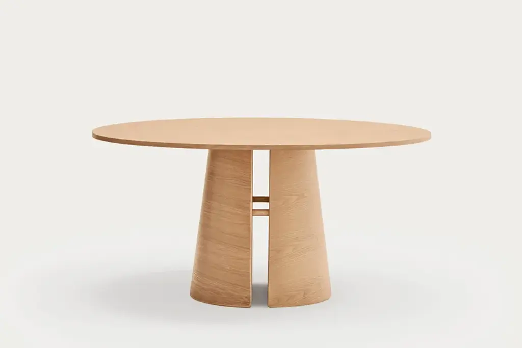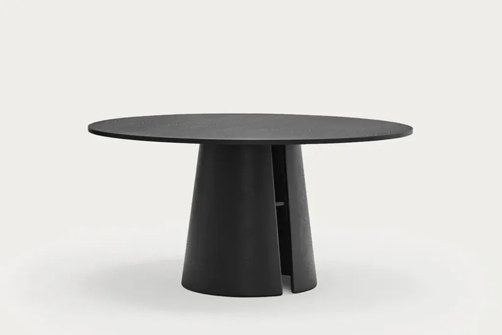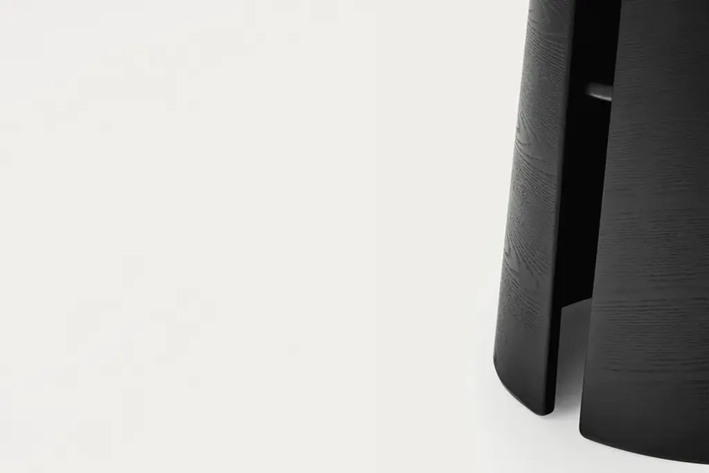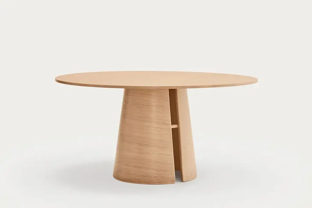 Cep is a table with veneered top and legs. Available in natural oak color or black-stained ash wood.Cep table set, is simple and minimalist, where the outmost of the construction process of the pieces have been sought: the curved wood. With only two symmetrical parts, the base is generated on which the top board rests, creating simple tables that highlight the nobility of the wood and caring details of this collection.