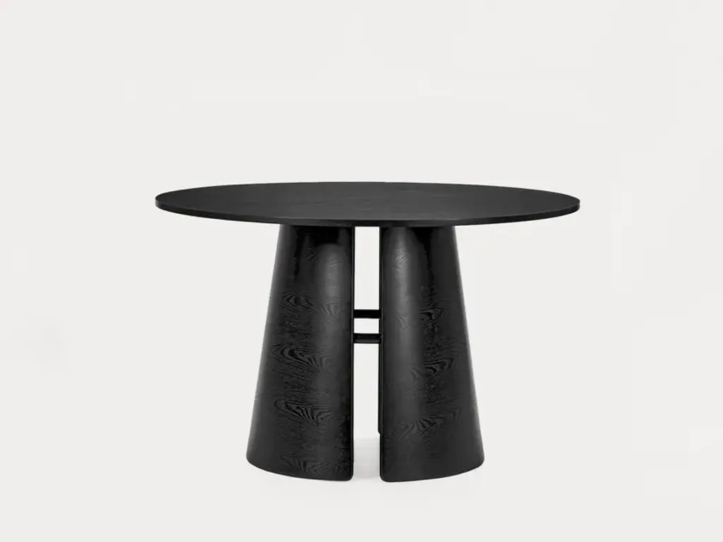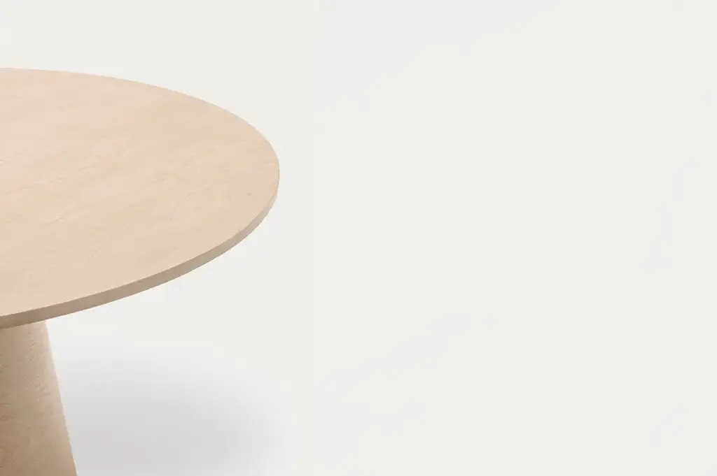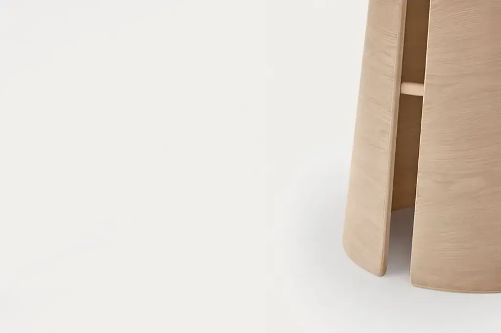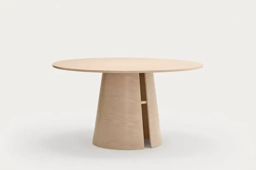Cep is a table with veneered top and legs. Available in natural oak color or black-stained ash wood.Cep table set, is simple and minimalist, where the outmost of the construction process of the pieces have been sought: the curved wood. With only two symmetrical parts, the base is generated on which the top board rests, creating simple tables that highlight the nobility of the wood and caring details of this collection.