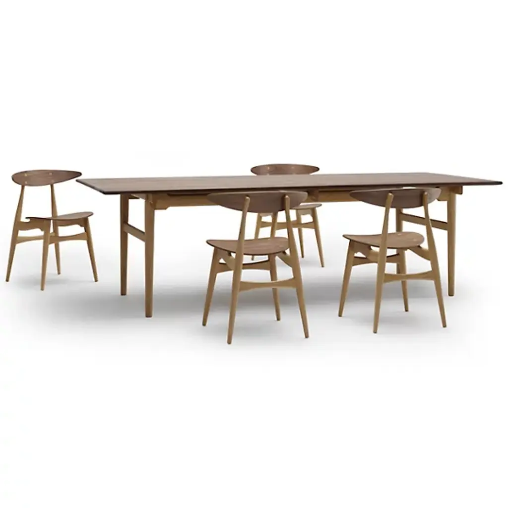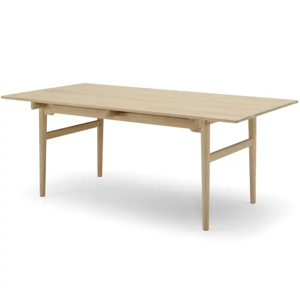 In 1962, Hans J. Wegner designed the Carl Hansen CH327 Dining Table specifically to accommodate the Wishbone Chair. However, the table's clean lines make it suitable for pretty much any seating (and for the office as well as the dining room). The top is a single solid piece of wood atop a solid wood frame and rounded tapered legs. Models of the CH327 with accessorizing black MDF extension leaves are sold separately.