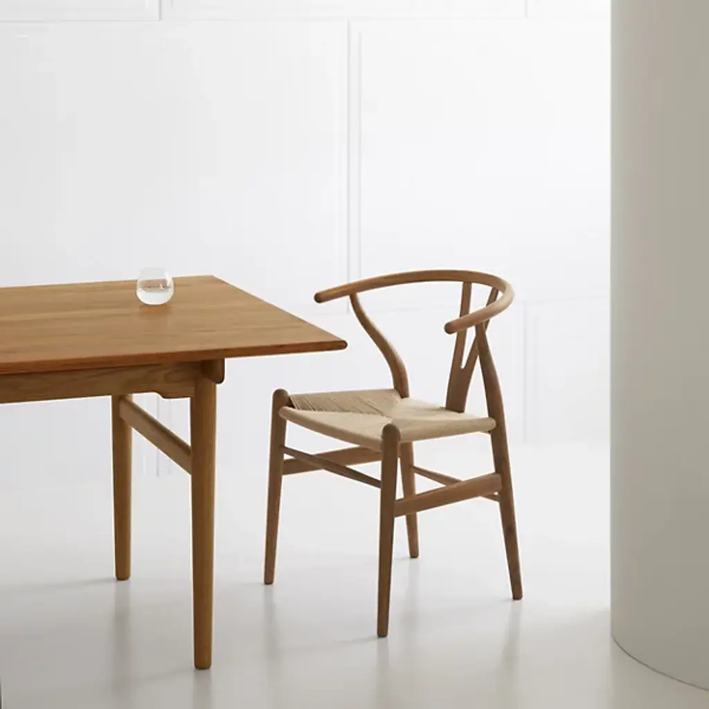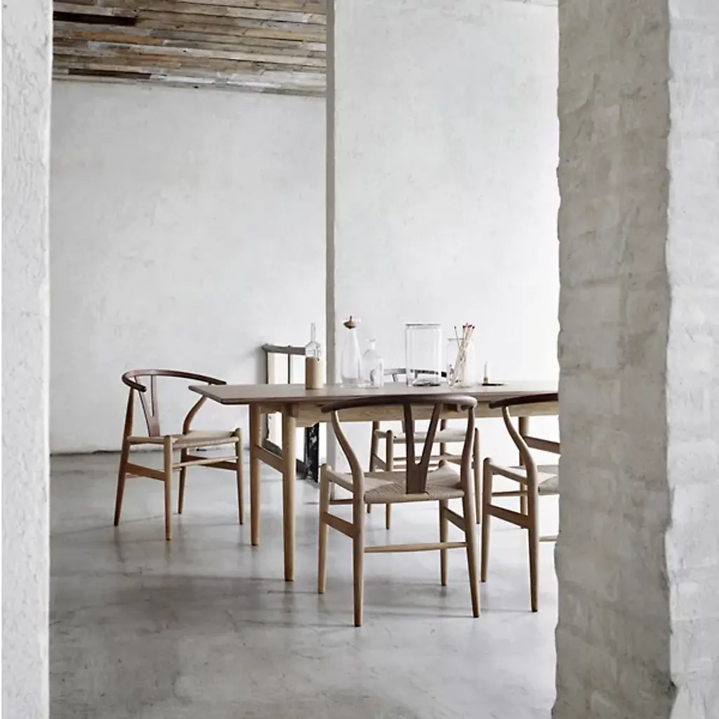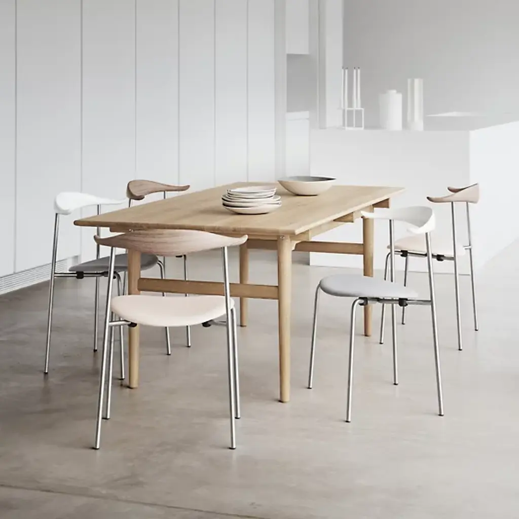 In 1962, Hans J. Wegner designed the Carl Hansen CH327 Dining Table specifically to accommodate the Wishbone Chair. However, the table's clean lines make it suitable for pretty much any seating (and for the office as well as the dining room). The top is a single solid piece of wood atop a solid wood frame and rounded tapered legs. Models of the CH327 with accessorizing black MDF extension leaves are sold separately.