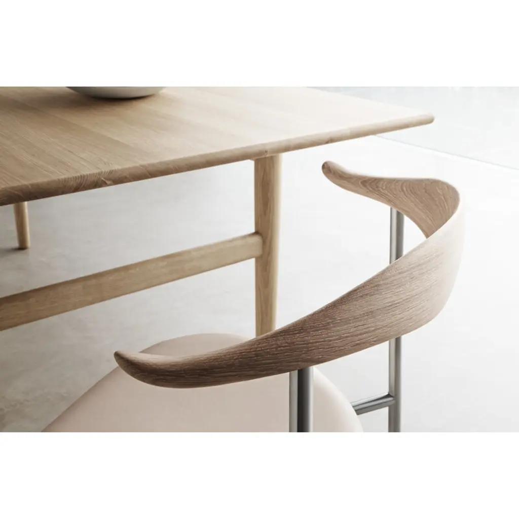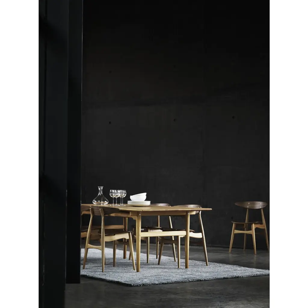 Carl Hansen & Søn’s CH327 dining table, designed by Hans J. Wegner in 1962, is a masterpiece of Danish design and woodworking. The solid wood tabletop with rounded corners has been placed on a subtly crafted support structure that makes the tabletop appear almost floating. Longitudinal wood grains, intricate joinery and tapered legs give the table a sophisticated finish. Measuring 74.8 x 37.4 x 0 in (190 x 95 x cm, cm), the CH327 table can accommodate about six people – and if using the separately sold extension leaves placed on both ends of the table, it can accommodate even 10 people. In addition to dining use, the CH327 table can also be used as a desk or a meeting table in the office.
