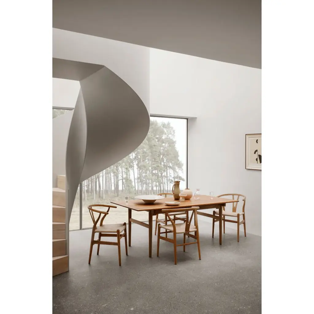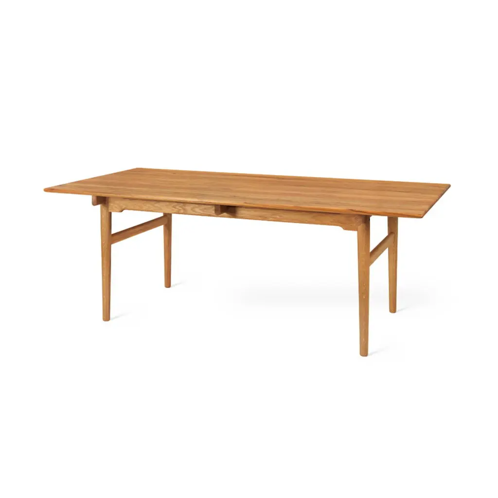 Carl Hansen & Søn’s CH327 dining table, designed by Hans J. Wegner in 1962, is a masterpiece of Danish design and woodworking. The solid teak tabletop with rounded corners has been placed on a subtly crafted oak support structure that makes the tabletop appear almost floating. Intricate joinery and tapered legs give the table a sophisticated finish. Measuring 74.8 x 37.4 x 0 in (190 x 95 x cm, cm), the CH327 table can accommodate up to six people. In addition to dining use, the CH327 table can also be used as a desk or a conference table in the office.