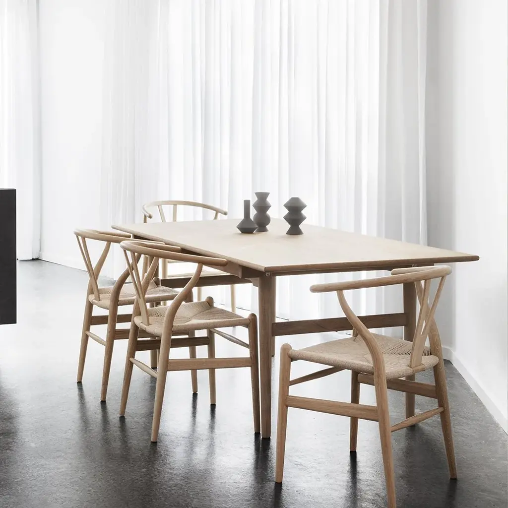 LIMITED EDITION: To celebrate Wegner's 100th birthday, Carl Hansen & Son has released a special walnut / oak combination CH327 Dining Table. This table features an walnut top and a oak frame to highlight Wegner's extraordinary understanding of wood. All other versions of the CH327 table have a top and frame in the same wood. It's no coincidence that Wegner's dining tables complement his chairs perfectly. They are both excellent expressions of his approach to timeless design. Wegner's dining tables reveal his profound understanding of wood and its possibilities. Combined with Carl Hansen & Son's uncompromising selection and workmanship of the best hardwoods, Wegner's tables are a daily pleasure with deep roots in the Danish forests. Form and function always find a perfect balance in Wegner's designs. His tables are as stable as they are comfortable, and their sculptural beauty can be appreciated from any angle. Like his chairs, Wegner's tables demand the very best of skilled craftsmen. His furniture's construction and joints were designed to be stable and beautiful - not to be easy to produce. IMPORTANT: Purchase a compatible Carl Hansen & Son table leaf . The CH327 Dining Table requires minor assembly. Click here for assembly instructions.