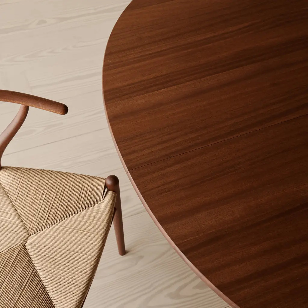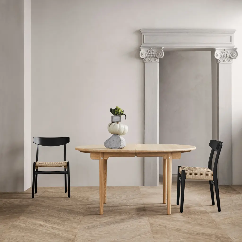 CH337 is the smallest in a series of quietly elegant and versatile solid wood dining tables by Hans J. Wegner, designed in 1962. Featuring an elliptical tabletop and rounded legs that gracefully taper toward the floor, it offers optional extension leaves to function as needed for entertaining varied numbers of guests. Rendered in oak, walnut, beech or mahogany with striking oiled, lacquered or soaped finishes, the table’s clean lines accentuate the beauty of the natural material.