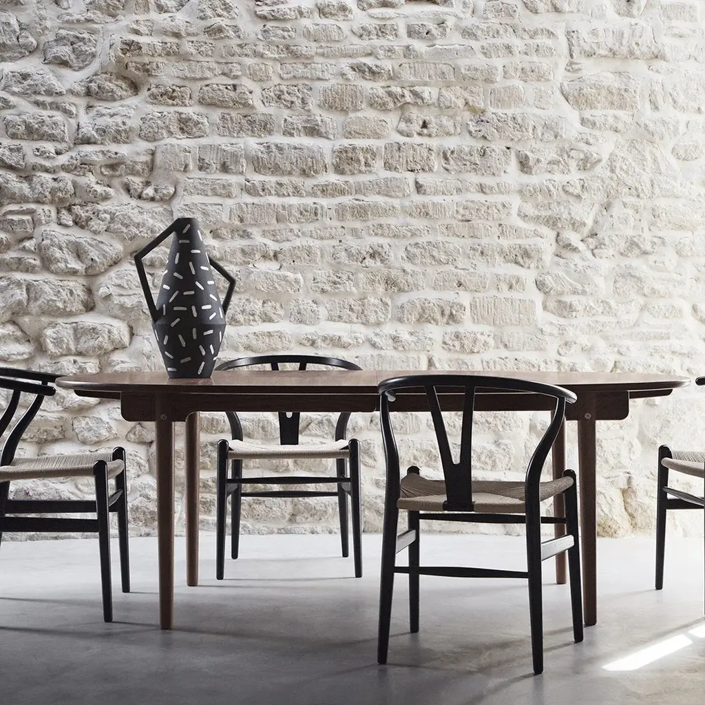 The CH338 Dining Table comes with 1 supporting wooden leg and hardware for 2 leaves (sold separately) , or with 4 supporting wooden legs and hardware for 4 leaves (sold separately). NOTE: Please note that if the table is ordered with more than one solid wooden leaf, only one leaf is produced from the exact same wood as the table top. Minor variations may occur in other leaves. Purchase a compatible Carl Hansen & Son table leaf . The CH338 Dining Table requires some assembly. Click here for instructions.