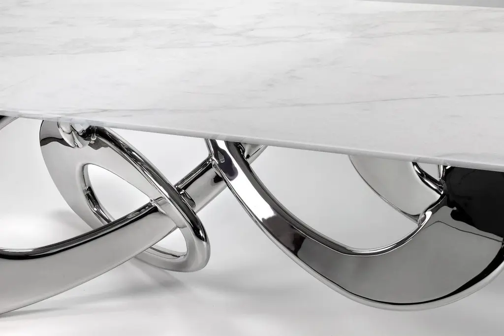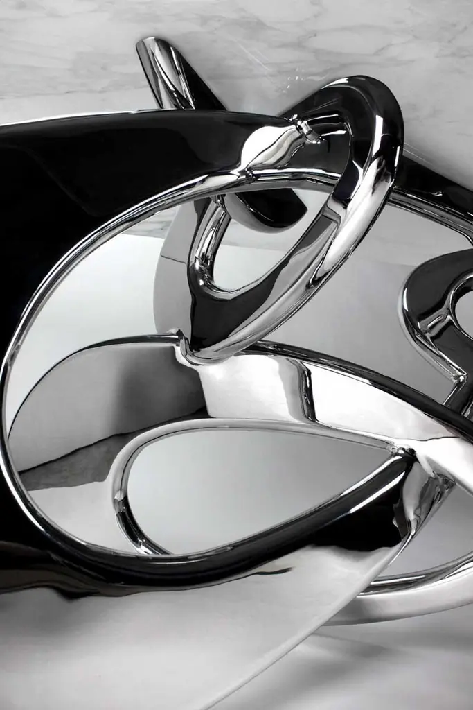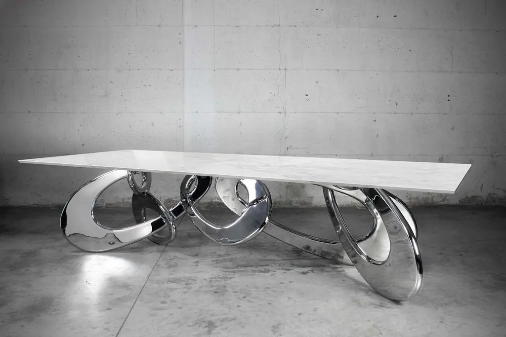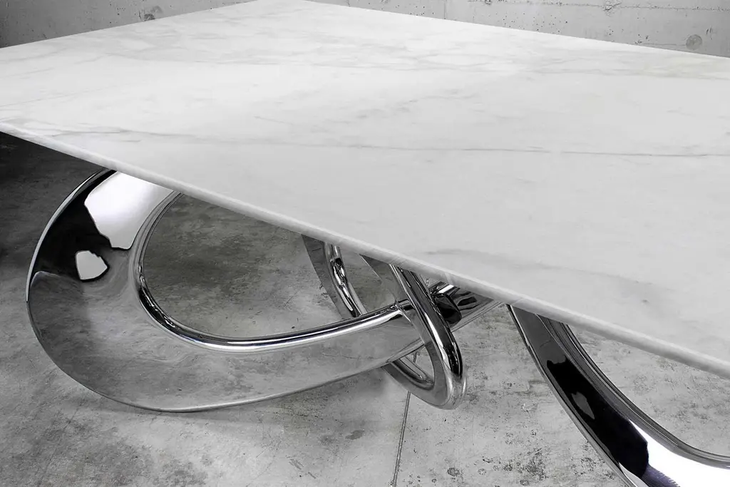Chained Up Miami Dining Table by Barberini & GunnellLimited Edition of 6Dimensions: D 120 x W 320 x H 76 cm.Materials: Calacatta marble, mirror polished stainless steel.The inspiration for this table came from observing the gigantic iron chains that are used for tying up enormous container ships or transatlantic cruisers.Spending hours at the port of Ancona we were intrigued by finding a way to build a table structure in the shape of a chain, every bangle connected to the other. Closing the chain, yet achieving a stable structure while at the same time not losing the esthetic beauty of the finished artwork was the challenge this table had up for us.The sculptural dining table ‘Chained Up Miami’ was presented by the Ammann Gallery during ArtBasel Design/Miami 2016.Limited Edition, signed and numbered by the artists, comes with a Certificate of Authenticity.Barberini & Gunnell, founded in 2009 in Ancona, Italy by architects Francesco Barberini and Nina A. Gunnell, is the result of a philosophy, thinking of design and architecture as a work of art. The architectural and interior design activity carried out by ‘The Studio’ complements the creations of ‘The Atelier’, which are the result of an artistic playground and highly skilled craftsmanship, a place where artworks and sculptures come to life.The Studio Barberini & Gunnell designs high-end residential and retail spaces that are out of the ordinary and beyond fashion. Barberini & Gunnell creates refined, timeless, and harmonious environments by inserting collectible design, “talking pieces” that create unique and bespoke homes according to the client’s eclectic and aesthetic desires.The Atelier Barberini & Gunnell creates artworks and collectible designs, one-off pieces, and limited editions for a small niche of high-end projects; bespoke solutions for luxury and ultra-luxury projects all over the world.The choice of the most precious materials, the maniacal cure for detail is the basis of our modus operandi aiming to create timeless pieces, using marine grade stainless steel, brass, cast bronze, precious wood essences, marbles, onyxes, semi-precious gemstones, crystal glass, together with the most sophisticated technologies and quality craftsmanship.This allows us to work for clients like Four Seasons Hotels, The Ritz Carlton, Regent Seven Seas Cruises, Louis Vuitton, Cartier, Dior, Paramount Pictures, Peter Marino Architects, Sotheby’s, Bonhams, Foundation of Maestro Andrea Bocelli, Ridley Scott (House of Gucci) besides our private collectors and clients.Values such as sustainability, the use of natural materials, the rediscovery of eco-sustainable craftsmanship, and the protection of refined and ancient techniques that are increasingly being lost are the basis of the design.Barberini & Gunnell’s signature works are exhibited at international art fairs such as Art Basel Design//Miami, Art Miami, Art Basel Switzerland, PAD London, PAD Genève, PAD Paris, PAD Monaco, Salon Art+Design New York…