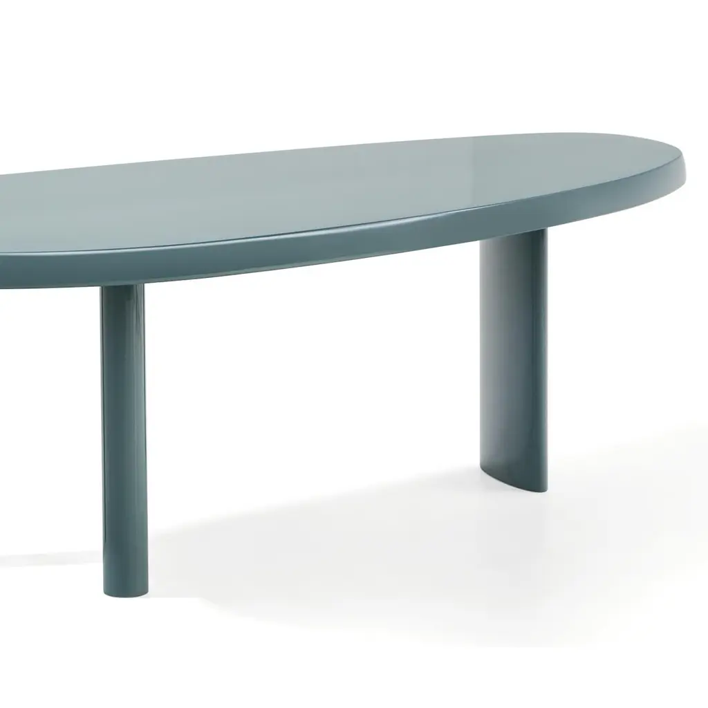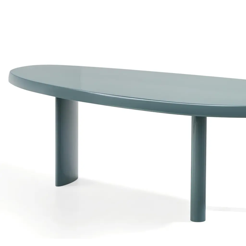 Sage green Forme Libre table designed by Charlotte Perriand in 1959. Relaunched by Cassina in 2011.Manufactured by Cassina in Italy.Charlotte Perriand started work on the tables en forme libre in 1938. Originally intended for her own atelier in the Montparnasse area of central Paris, they went into production courtesy of Galerie Steph Simon at the end of the 1950s. All rounded edges, and asymmetrical lines, these tables are perfectly suited to accommodating up to eight guests in small spaces. The table has three legs: one is oval with a wider footprint, the other two are smaller and are cylinder-shaped. In 2011, Cassina re-issued this piece, reducing the width of the legs to offer more space and allow guests to sit closer to each other on convivial occasions. The table-top is composed of wooden staves that slot into each other, the joins being seen at the ends, testifying to the Cassina company’s exceptional carpentry skills; any variations in the wood are part of the very nature of the raw material and serve to highlight its inherent beauty. Important information regarding images of products:Please note that some of the images show other colors and variations of the model, these images are only to present interior design proposals. The item that is selling is on the first image. Important information regarding color(s) of products:Actual colors may vary. This is due to the fact that every computer monitor, laptop, tablet and phone screen has a different capability to display colors and that everyone sees these colors differently. We try to edit our photos to show all of our products as life-like as possible, but please understand the actual color may vary slightly from your monitorAbout the designer:Charlotte Perriand full membership of that avant-garde cultural movement which, from the first decades of the 20th century, brought about a profound change in aesthetic values and gave birth to a truly modern sensitivity towards everyday life. In this context, her specific contribution focuses on interior composition, conceived as creating a new way of living, still today at the heart of contemporary lifestyle.In the sphere of 20th century furnishing history, the advent of modernity made possible the entrepreneurial audacity of this true reformer of interior design. At the beginning of her professional career she was acclaimed by critics for her Bar under the roof, exhibited at the Salon d’Automne in 1927 and constructed entirely in nickel-plated copper and anodized aluminium. In the same year, when she was just twenty-four years old, she began a decade-long collaboration with Le Corbusier and Pierre Jeanneret, at the famous design studios at 35, rue de Sèvres in Paris.Her presence in the Le Corbusier studio is visible in all the furnishings designed with him and with Pierre Jeanneret: and so Charlotte Perriand becomes a cornerstone in the reformation project promoted by the architect, adding a distinct dimension of humaneness to the often cold rationalism of Le Corbusier. In her creations she manages to animate the fundamental substance of daily life with new aesthetic values: in particular her talent and intuition in the discovery and use of new materials manifest themselves to their full extent.The ten-year long collaboration with Le Corbusier and Pierre Jeanneret, and her Japanese experience, represent periods of intense creative effervescence in the life of the artist. During her long stay in the Far East (‘40-‘46), she reveals her artistic talent to the full, through a reinterpretation of the reality of life to echo both tradition and modernity. By way of example, worthy of mention are the furnishings produced using traditional bamboo processing techniques, capable of enhancing the new forms already experimented using steel-tubing.After her work as a professional, she concentrates on a series of original and balanced productions, commissioned by top-level authorities and leading companies of the calibre of Air France, and by a number of foreign organizations, authenticating the fame she had by now gained on the international scene.About the manufacturer:In a continuing dialogue between past, present, and future, Cassina has created the I Maestri collection, revisiting furnishing designs by the twentieth century’s best-known architects, including Le Corbusier, Pierre Jeanneret, Charlotte Perriand, Charles Rennie Mackintosh, Gerrit Thomas Rietveld, Franco Albini, Frank Lloyd Wright and Marco Zanuso. While the designs and functional concepts have been precisely preserved, the models have been manufactured using evolved technology. This is also the company that has manufactured iconic pieces of contemporary design from the 1950s to the present day, ideated by some of the most important international designers. Today Cassina continues to look to the future of design with audacious, passionate curiosity and an open, holistic approach. It affirms its exclusive ability to furnish a home’s living and dining spaces completely and iconically with The Cassina Perspective: a concept, a philosophy, an informed, futuristic thought. A detailed, expansive horizon of combinations; when placed together, the products have an innovative soul and the modern icons create authentic, welcoming, personal atmospheres involved in a conversation dominated by a code of design excellence, formal sensitive awareness, solidity and cultural authority.