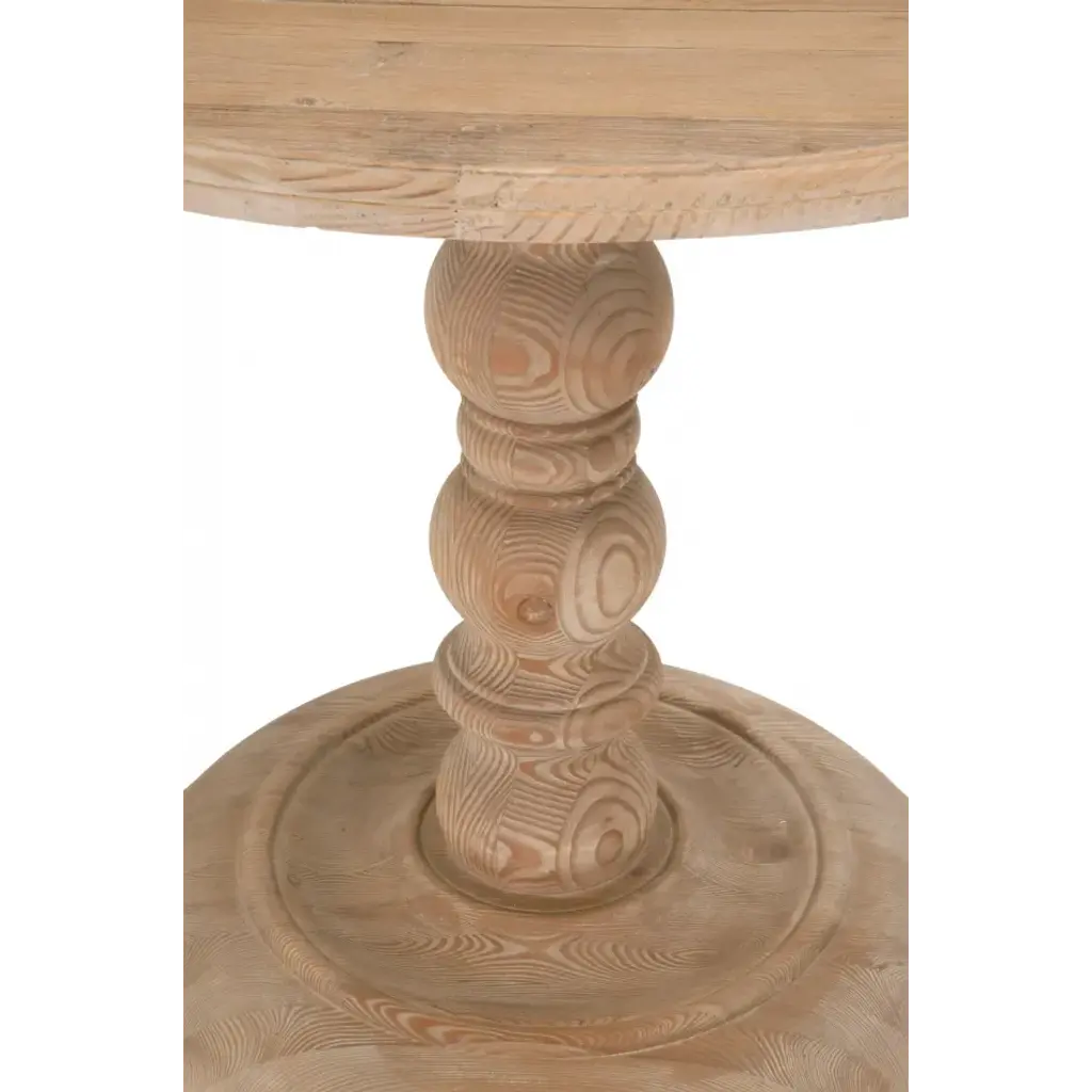 Transitional style dining table featuring a turned wood pedestal base made with solid pine, and a round top made with Pine Veneer.