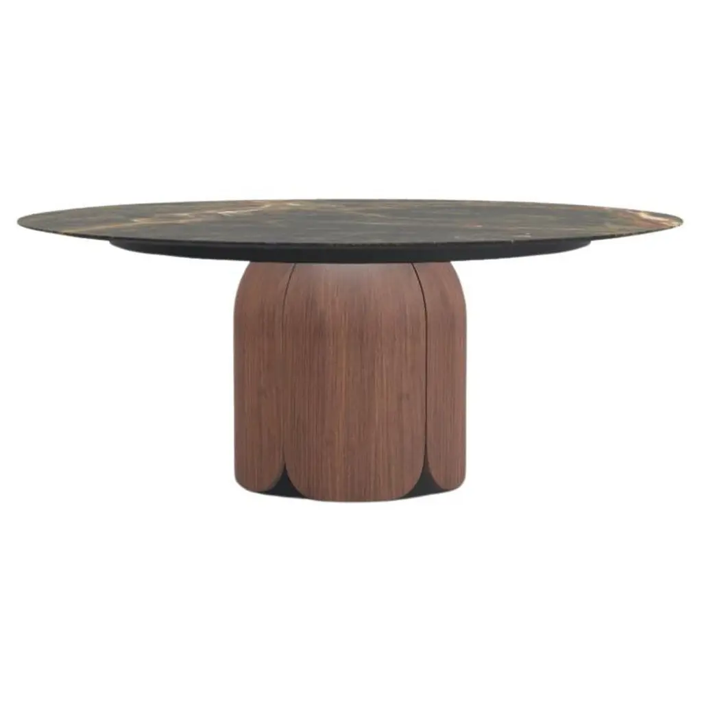 Cherry Sepia Sahara Noir Bloom Dining Table by Milla & MilliSigned by Maša Vukmanović, Jelena Lukač Kirš, Jakov ŠrajerDimensions: W 180 x D 180 x H 75 cm Materials: Walnut Natur, Black Metal, Marble Sahara Noir. Bloom Dining Table:It is time to connect with Mother Nature on a new and deeply emotional level. Have a seat at the Bloom dining table and release yourself to the experience. Recognize the story told by the mighty walnut wood and magnificent Italian marble, and share the wonder with your companions. Let the inspiration overtake you.Milla&Milli started out as a brainchild of two artlovers; a shared dream of two souls in love with design, wood and each other. And to this day, that love and passion is still clearly embodied in every masterpiece we create.Meet Ksenija and Ivić Pašalić, two halves of one Milla&Milli heart and the driving force behind everything you have seen so far.A CELEBRATION of design:"We truly live and breathe design. We love it, respect it, encourage it, promote it. We put it at the forefront of everything we create and with the help of meticulous craftmanship, we build our story through it.Meet our leading designers, Jelena Lukač Kirš and Jakov Šrajer, and the company's art director, Maša Vukmanović."AN ODE to Mother Nature:"We consider ourselves as doers first, talkers second. So, our ode isn't one of words, but of heartfelt and decisive action. And one you are invited to join. Our pledge is to create new life, to plant a new tree for every piece of furniture you buy. Thus, the park forest growing around our facilities stands as a living and breathing reminder of our shared mission — to protect and respect our Mother Nature."