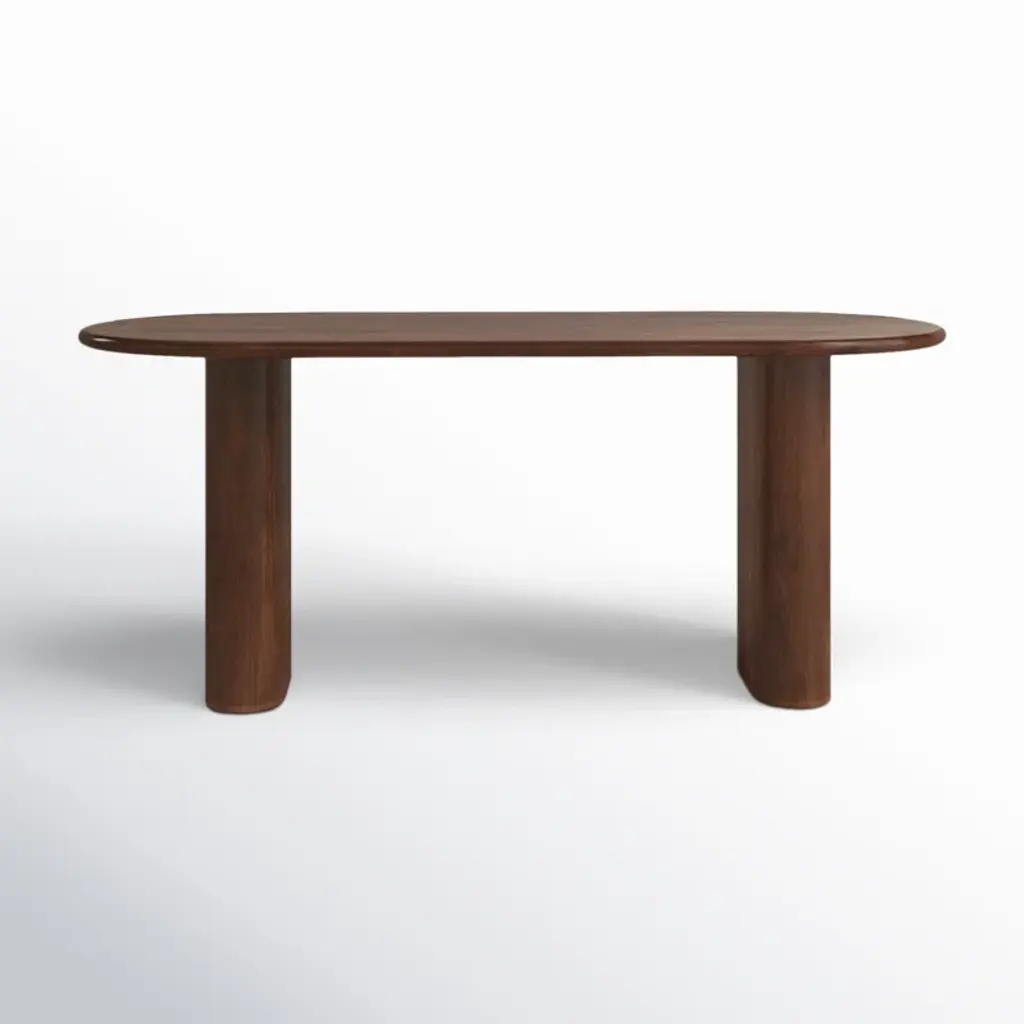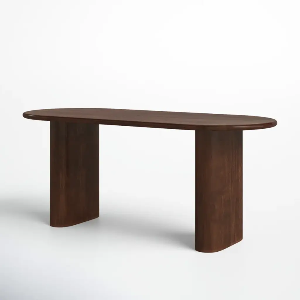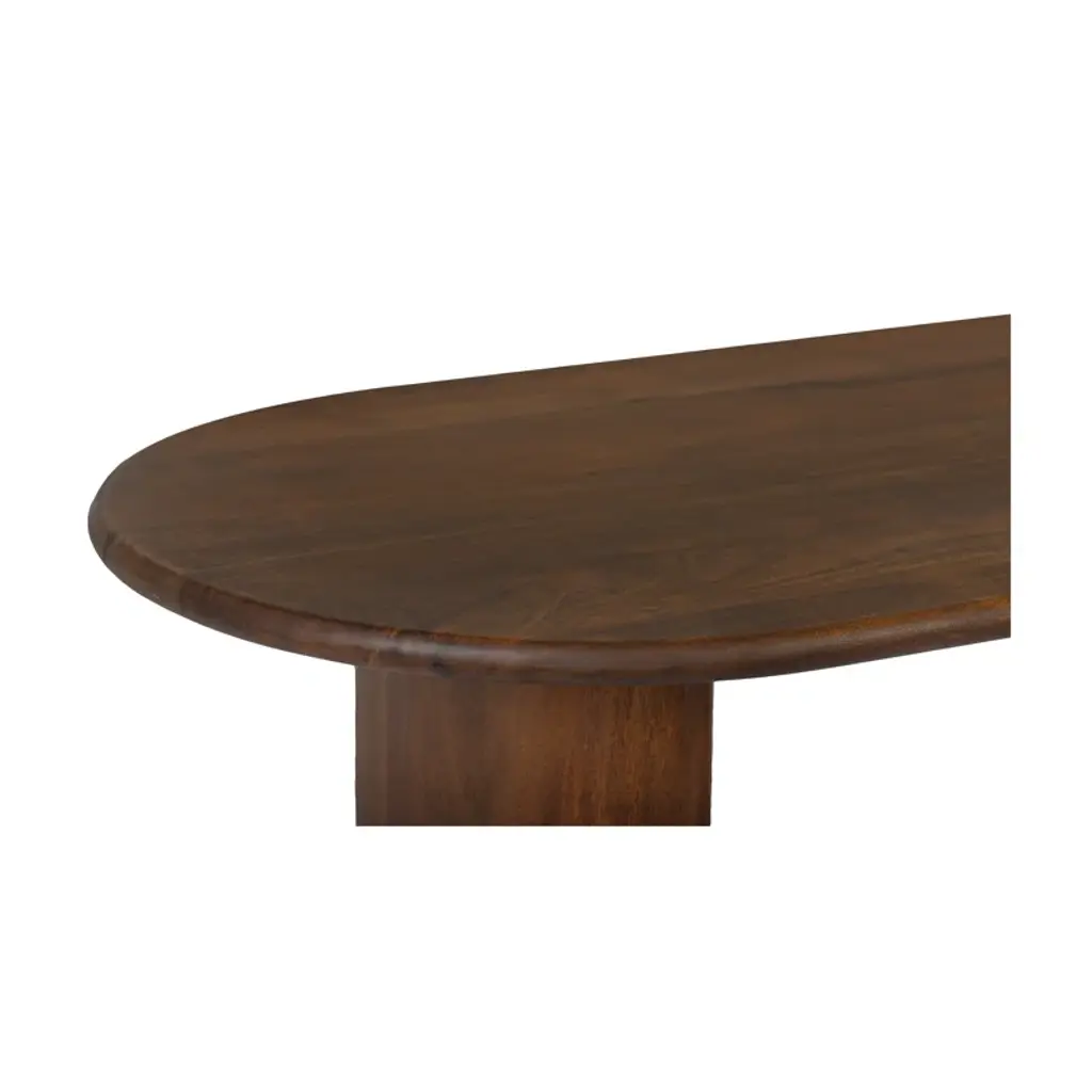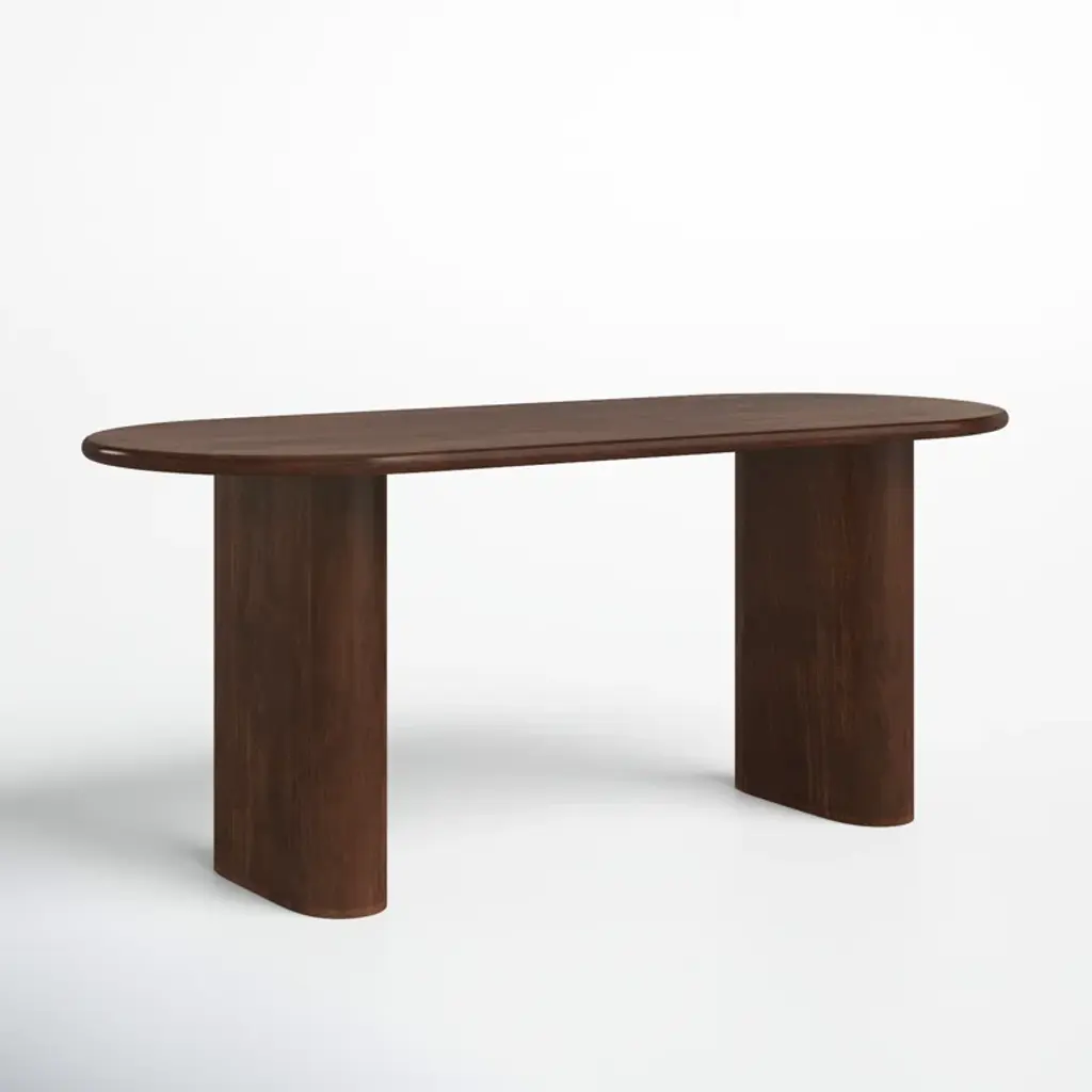 The Ovale dining table is made of solid acacia. It features soft rounded edges, solid wood legs, and is finished in a Porto dark stain.