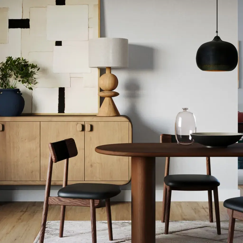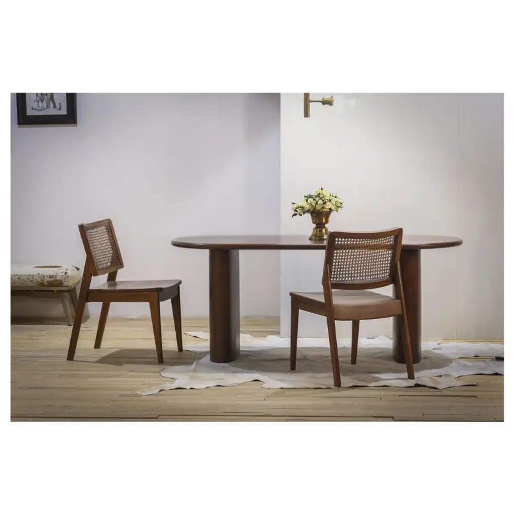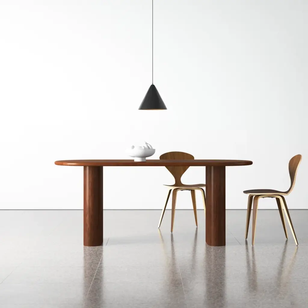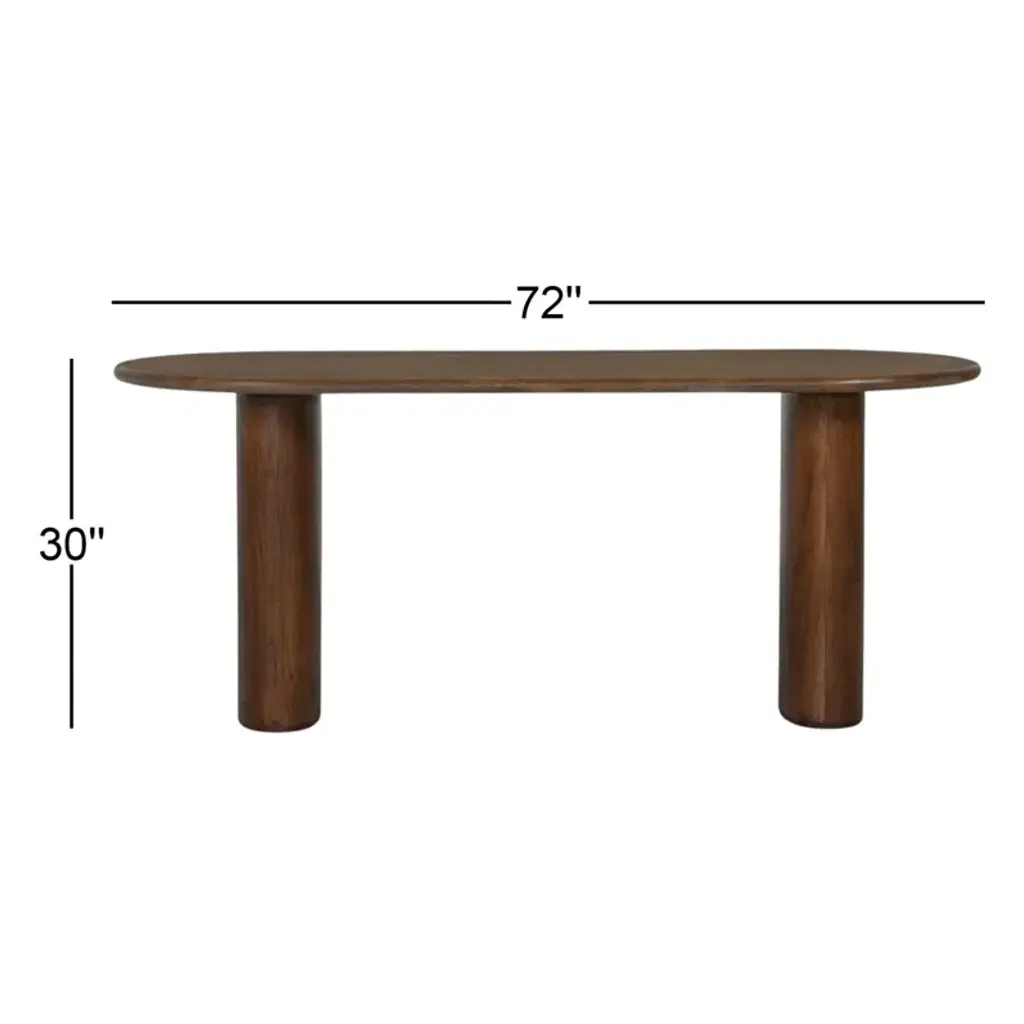 The Ovale dining table is made of solid acacia. It features soft rounded edges, solid wood legs, and is finished in a Porto dark stain.