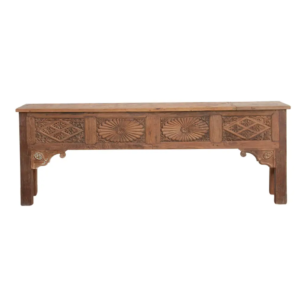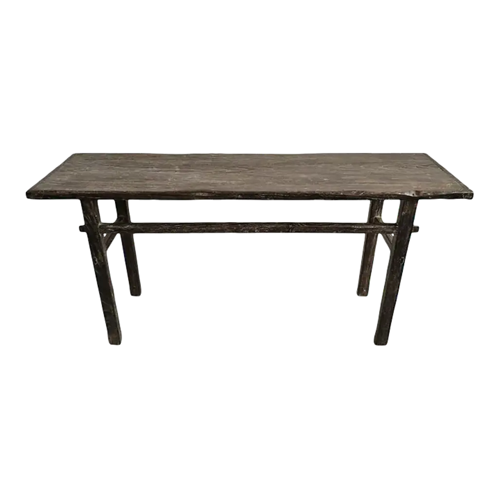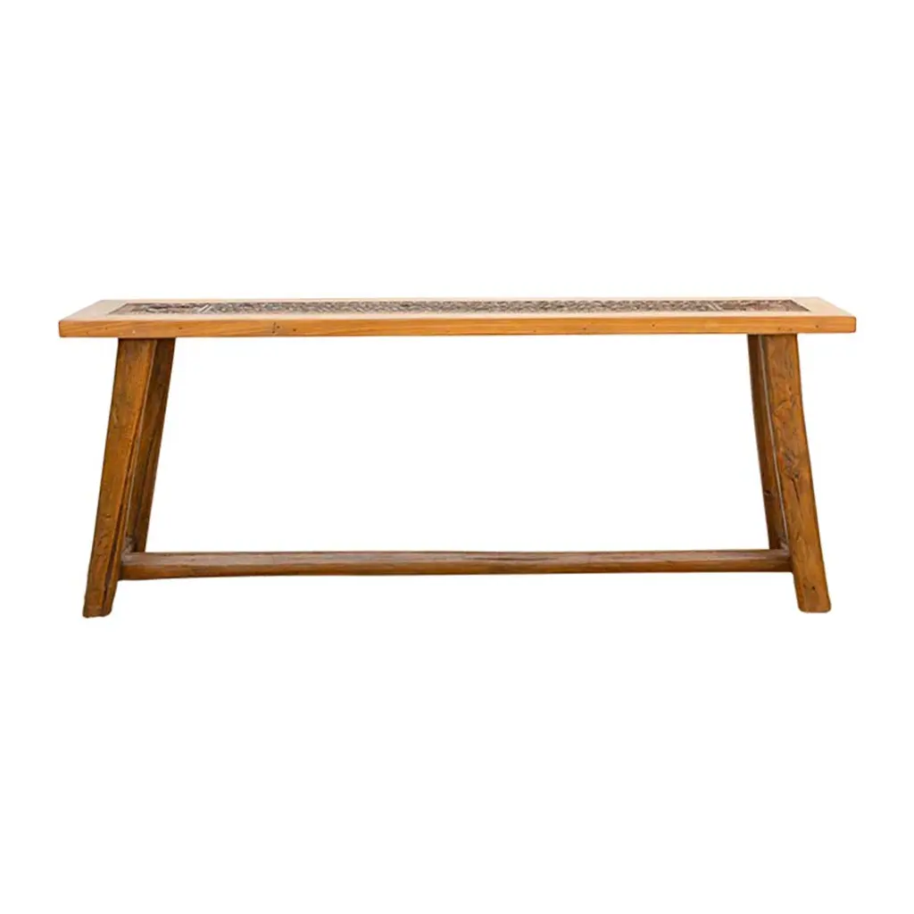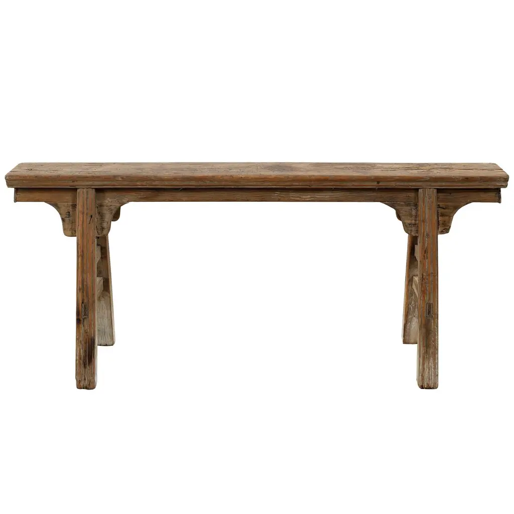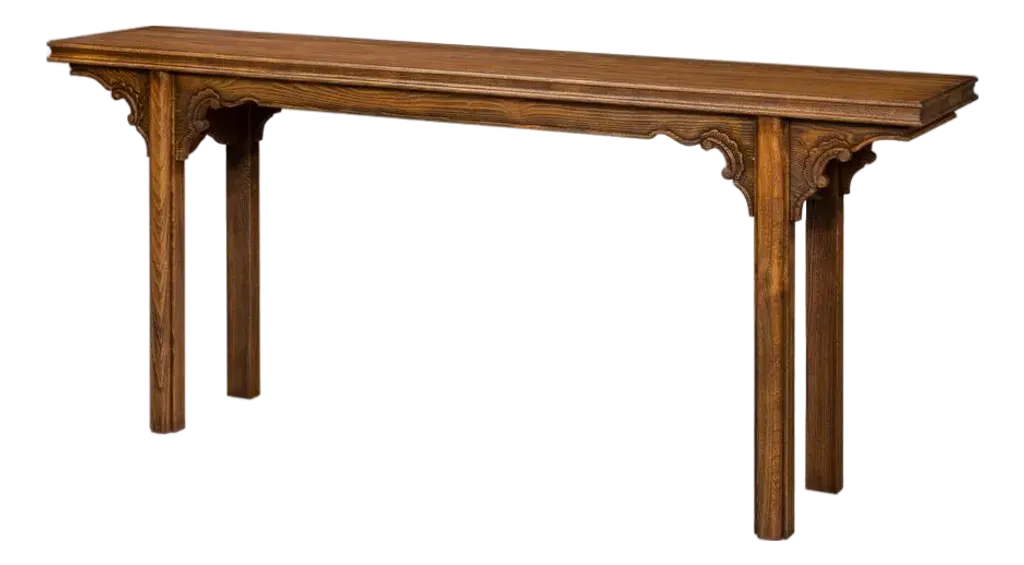 Console reflects timeless Eastern design, blending graceful proportions with artisanal detailing. Finished in a warm Husk tone, this piece captures the elegance of Ming-inspired furniture with its long rectangular form and decorative carved aprons on both the front and back. Perfect for entryways, dining rooms, or behind a sofa, the console table balances refined craftsmanship with versatile function. Its elongated surface offers generous space for display, while the carved apron adds depth and artistry. A fusion of historic influence and contemporary appeal, this piece makes a distinguished addition to any interior.Dimensions: 76" W x 15" D x 32" H