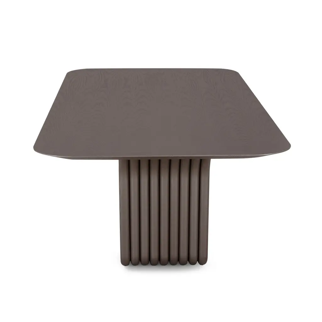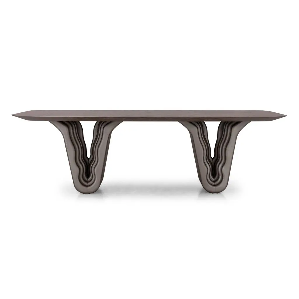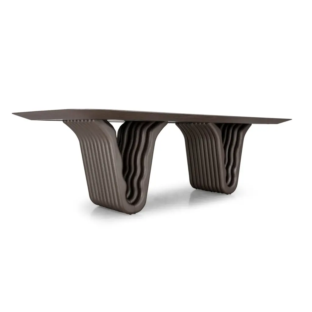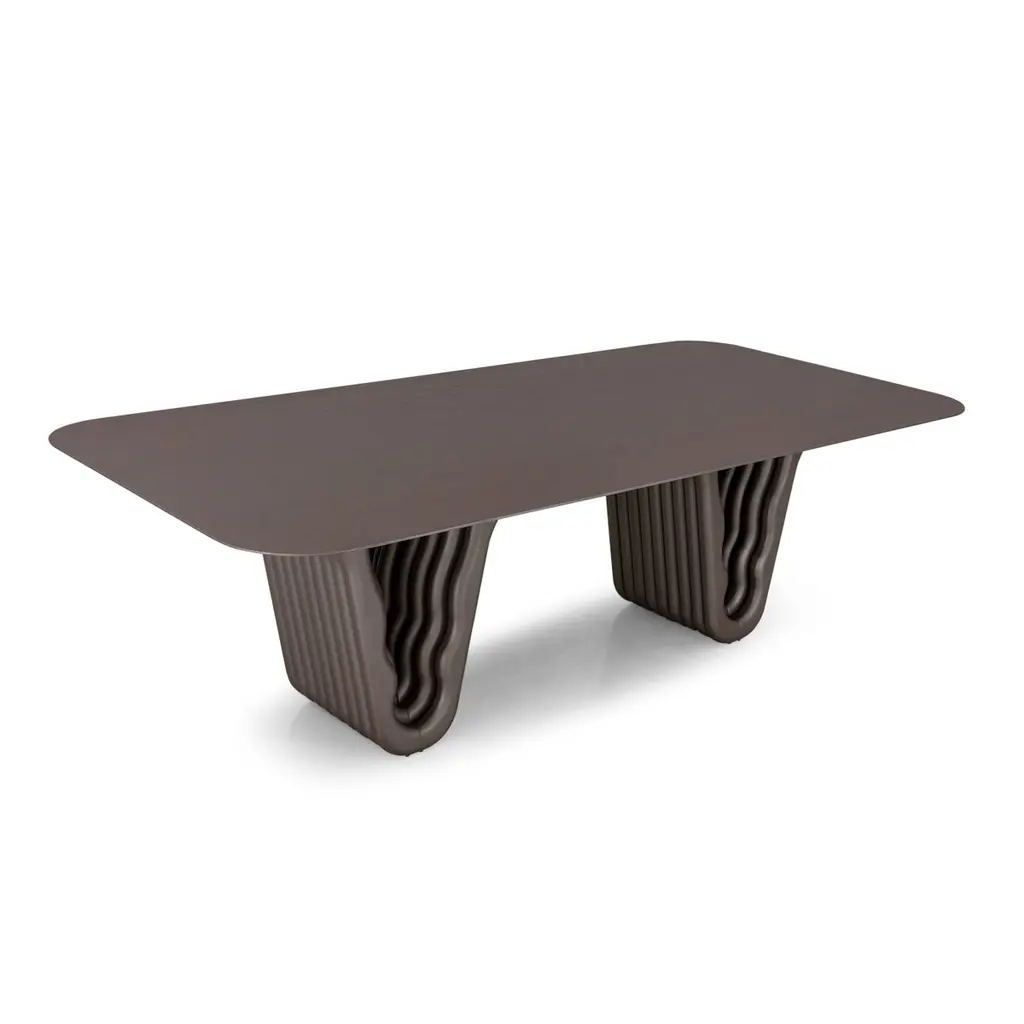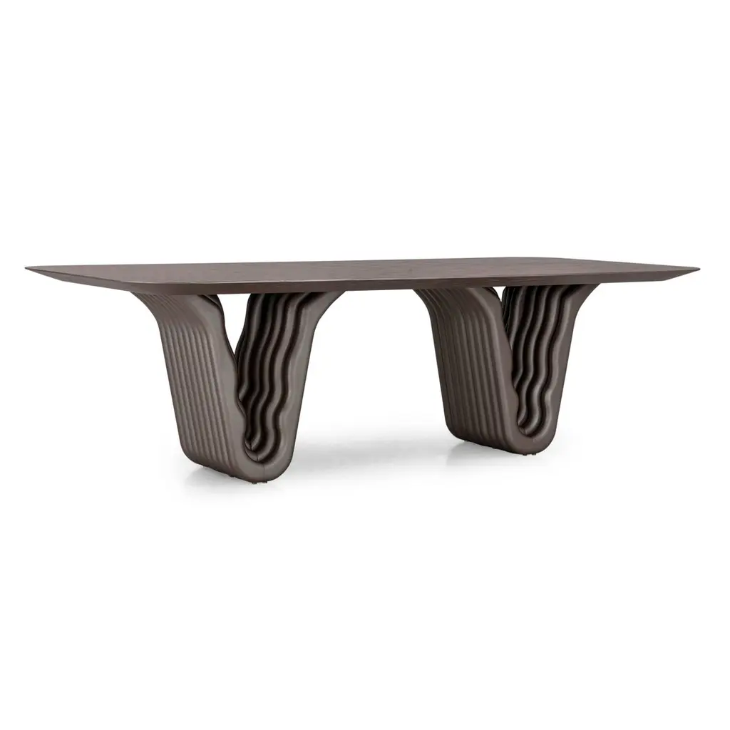 A Dolomitas dining table designed by Studio + A! for Uultis with chocolate oak finish and 98-Inch veneer top. Please check availability prior to purchase.The Dolomitas Dining Table pays homage to the breathtaking beauty of the Dolomites, a UNESCO World Heritage site celebrated for its dramatic landscapes and geological wonders. Its chocolate oak veneer top, with rounded corners and beveled edges, evokes a sense of refinement and lightness. Paired with a sculptural base finished in a complementary chocolate metallic tone, the table captures the rugged yet elegant essence of the Dolomite mountain range.Perfect for both residential and commercial settings, this 98-inch dining table provides ample space for hosting dinner parties, family meals, or formal gatherings. Its design is not only functional but also a conversation starter, inviting guests to marvel at its architectural form. Beyond the dining room, the Dolomitas table can serve as a stunning conference or workspace, blending style with practicality.Crafted with quality materials, this table ensures durability and timeless appeal. Assembly is required, but the process is straightforward with included step-by-step instructions. Bring a piece of the Dolomites' grandeur into your home, where nature-inspired design meets contemporary sophistication.