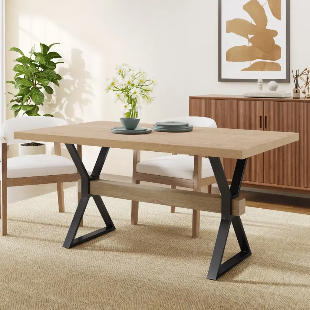 The table brings a perfect blend of rustic charm and modern design. The sturdy metal frame and X-shaped legs offer a bold, industrial touch, while the wooden tabletop adds warmth and character to any dining area. The unique combination of materials creates a dynamic, stylish look that effortlessly complements contemporary or farmhouse-inspired decor. Ideal for family meals or entertaining guests, this table provides ample space and a durable surface, making it both a practical and attractive centerpiece for your home. Includes: One (1) Dining Table Material: Iron and MDF Dimensions: 36.00” deep x 63.00 ” wide x 30.25 ” highLeg Height: 28.50" Muti-Color Options Assembly Required