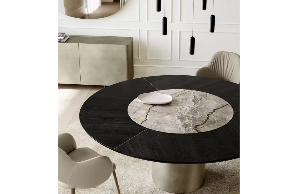 Luxurious Cilindro Table with wood and ceramic top is the perfect round design table to add a touch of class to your dining or living area. Thanks to the design by Ollen Pal, this table fits comfortably in contemporary spaces. The base is made of painted metal, available in single color or two-tone, while the round top is defined by an outer wooden frame divided into three sections and a central rotating or fixed part in ceramic.A distinctive and unique element is the cylindrical base in painted metal, available in two-tone or single color, which in the marble top version is further enhanced by the precious marble ring that coordinates with the top. Available with tops in glass, wood, or ceramic, in round shapes (which can optionally be paired with a Lazy Susan), rectangular or shaped. The xurious Cilindro Table is also available with large tops thanks to the double base.The Luxurious Cilindro Table’s versatility in size and finish options makes it adaptable to different spaces, from cozy dining areas to spacious open-plan rooms. This piece exemplifies Eforma’s dedication to blending high-quality materials with Italian artistry, creating a functional yet visually captivating centerpiece.Elegant and refined is the version with round and shaped ceramic King top, characterized by an elegant and refined rounded lacquered profile that fully embraces the top.