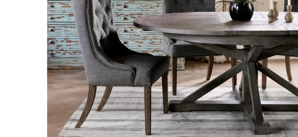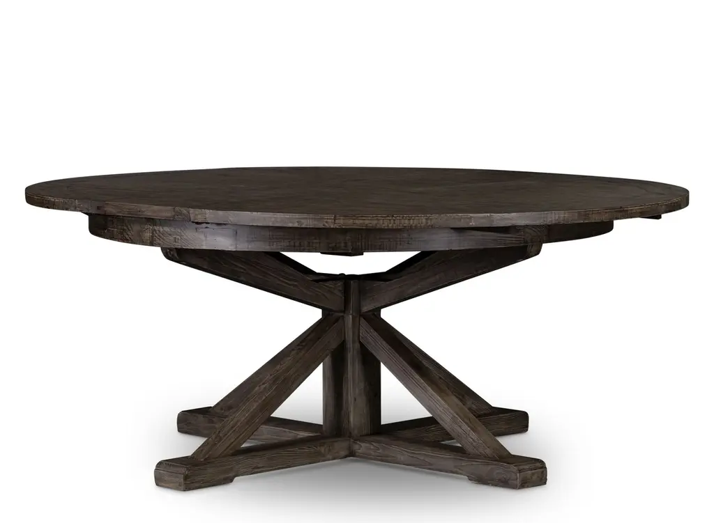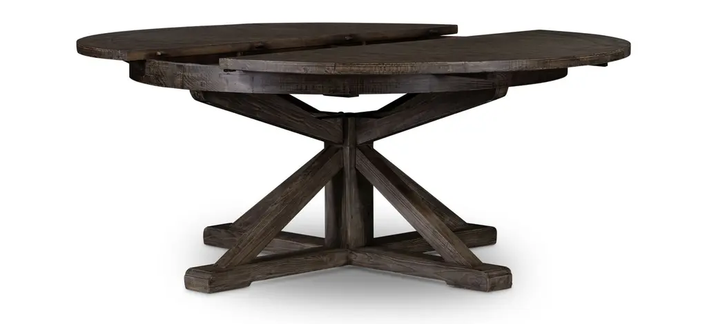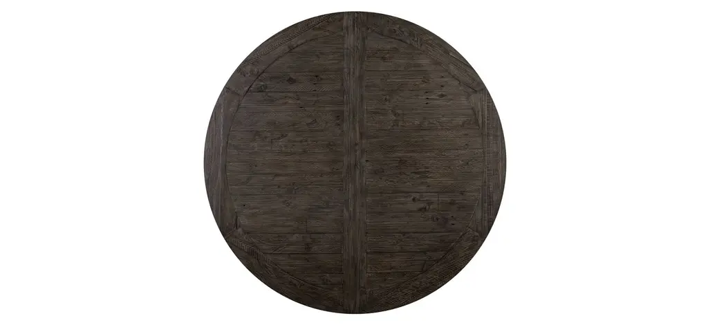 A welcoming, round farmhouse table draws the eye with its reclaimed wood top and a compelling architectural base in a rustic black olive finish. Easily extends to 79" with built-in leaf.