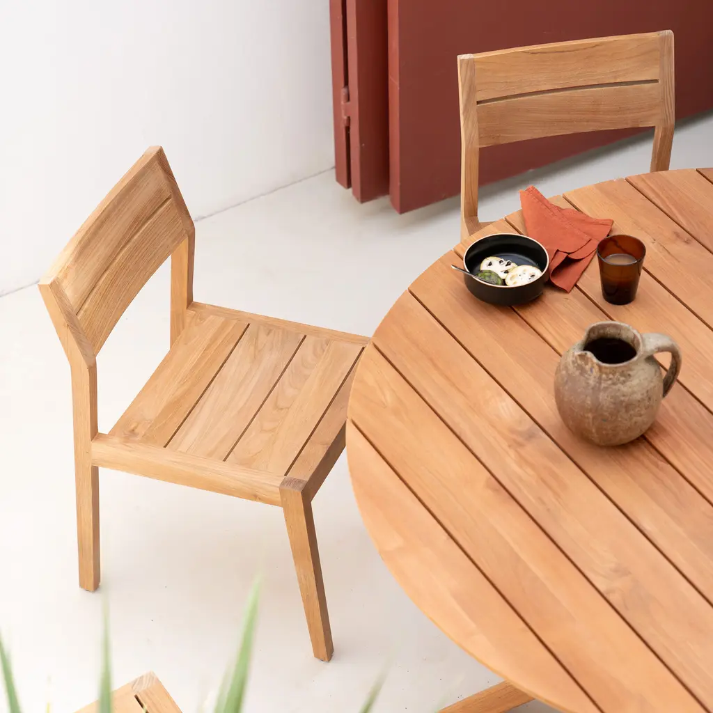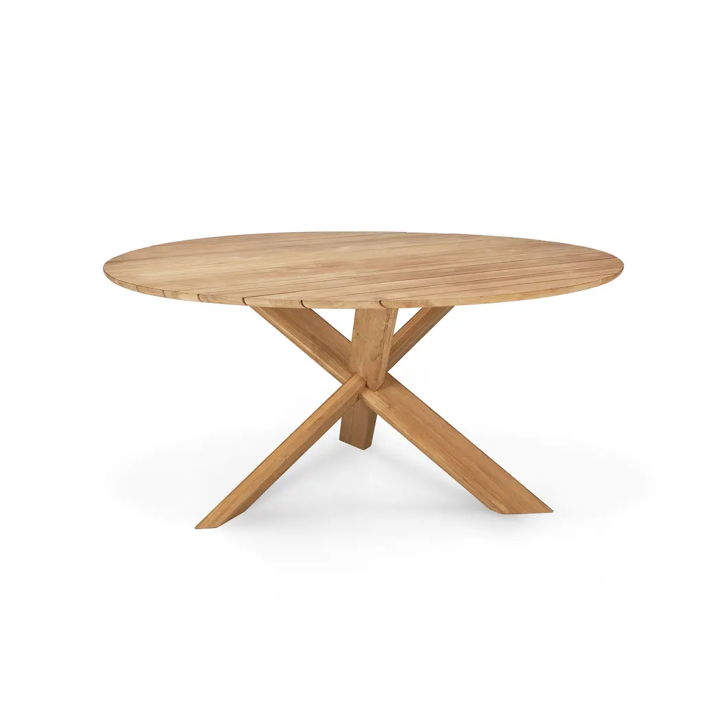 Gather your loved ones together around the Ethnicraft Circle Outdoor Dining Table which is elegantly designed with a circular tabletop and a sculptural base. The grooved top highlights the textures of the solid wood, while the intertwined legs add a creative accent to the design. Made for both indoor and outdoor use, the table is manufactured from teak wood, which resists the elements and develops a beautiful patina over time. Each Ethnicraft Circle Outdoor Dining Table comes flat-packed for more convenience, with the assembly hardware included. Thank to the minimalist design, this outdoor table works well with any chairs or with the Ethnicraft chairs from the outdoor dining collection.