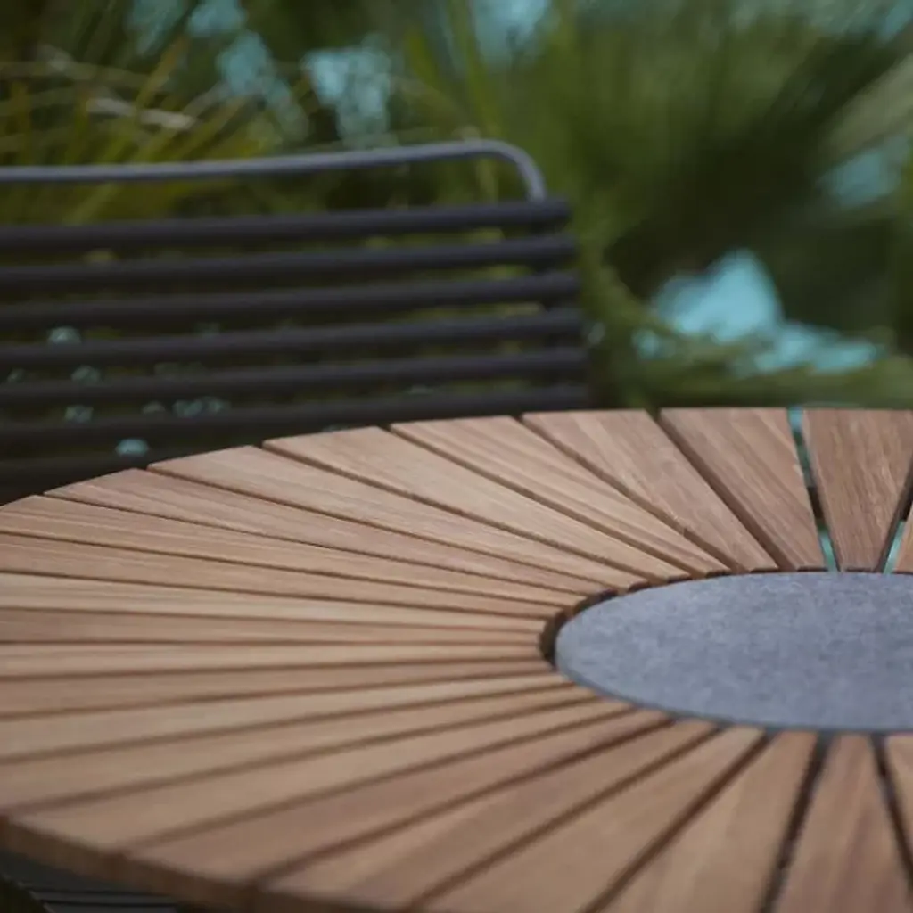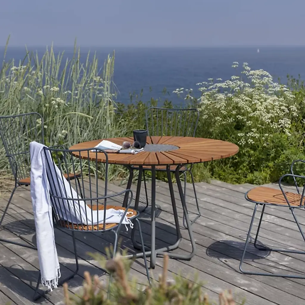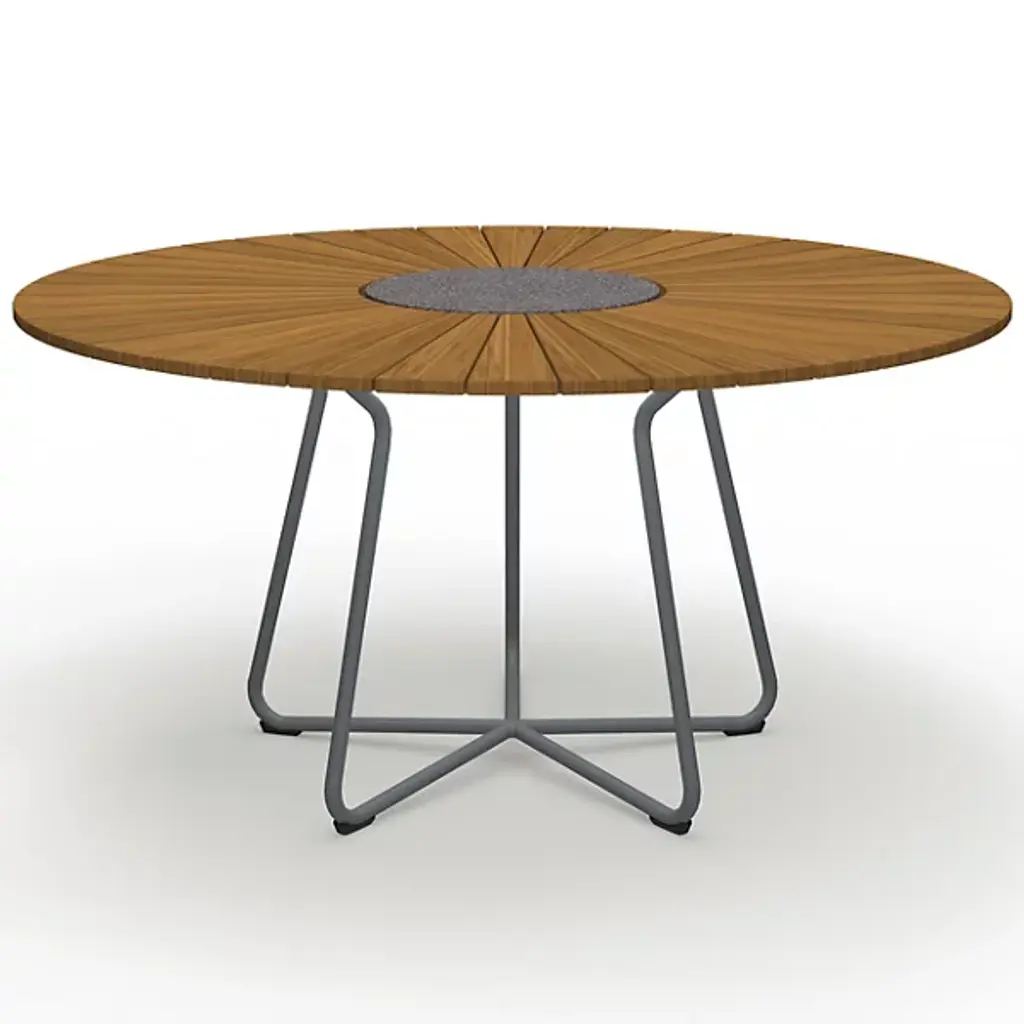 Presented by Houe, the Circle Dining Table is a contemporary luxury furnishing with Scandinavian-inspired touches throughout the composition. Designed by Henrik Pedersen, it features a pre-oiled bamboo lamellas table top with a granite stone accent at the center and grey powder-coated aluminum legs. Suitable for display among indoor and outdoor spaces, this is an attractive furnishing that will elevate the surroundings while offering you and your guests a lovely place to dine.