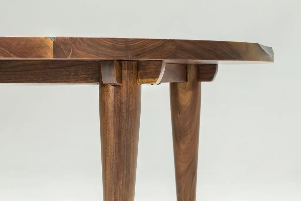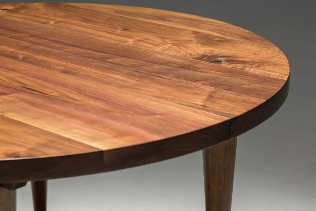 The Warren dining table is an expanding circular dining table made of solid walnut boards. The simple and sleek tapered legs are capped in brass to add elegance and style to the table. With added leaves to the table, it has the versatility to fit any space. This is a made to order item andCustom sizing and materials options are available upon request.