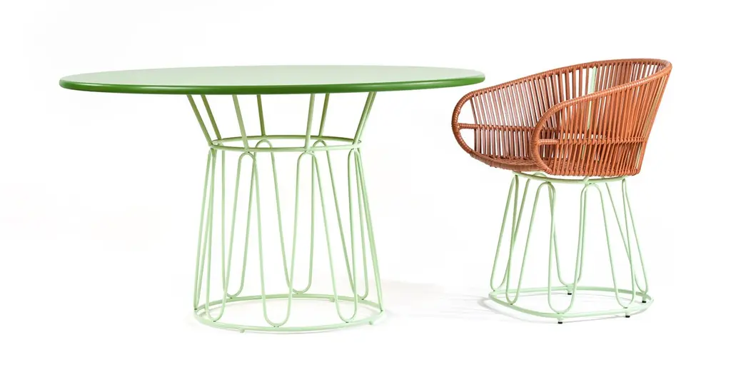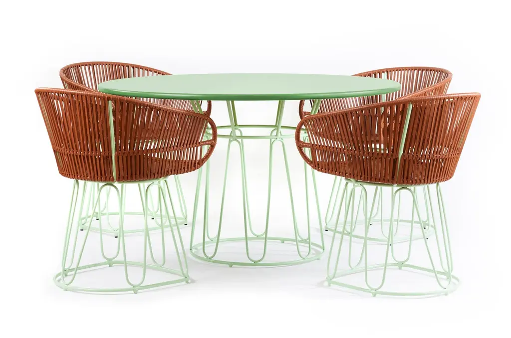 Circo dining table by Sebastian HerknerMaterials: Galvanized and powder-coated tubular steel. Aluminum top. Technique: Weaved by local craftspeople in Colombia. Dimensions: Top Diameter 135 cm Base Diameter 59 x H 77.5 cmAvailable in colors: menta / menta, carne / carne, black / black, sand / sand.Featuring gentle curves and vibrant colors, the round circo dining table adds a touch of colorful elegance to indoor and outdoor spaces. A design by Sebastian Herkner, the table is an ode to Colombia's vibrancy and passion for colors. The piece combines a metal tabletop with a powder-coated steel frame in matching shades. Each table is made in Santa Marta, a city on the Caribbean coast of Colombia, by local craftspeople. The steel frame is fire galvanized to protect the material from rust and corrosion by bathing it in molten zinc. Afterward, the frame is powder-coated with colored lacquer. Just the preparation of all the materials takes 20 days, while the production of each table takes two days. German designer Sebastian Herkner is a long-term collaborator of Ames and has visited Colombia multiple times to experience the country’s cities, nature and people first hand. He also visited many of the ateliers that Ames has partnered with to learn about the unique traditional crafts of Colombia's regions. A sought-after contemporary designer and recipient of many industry awards, he has worked with many international design brands, creating intriguing pieces that showcase his intuition for interesting material, color, and texture combinations.