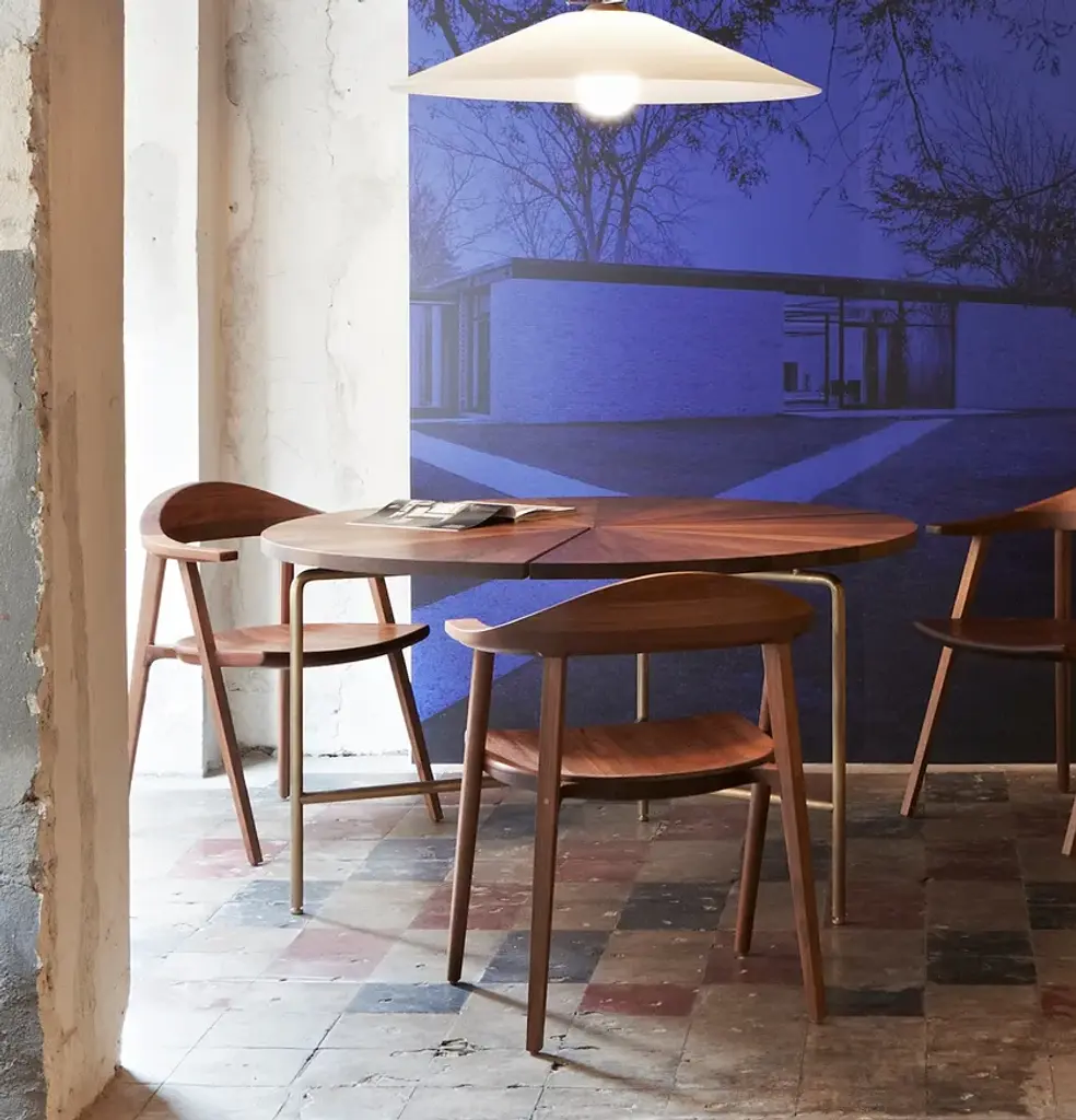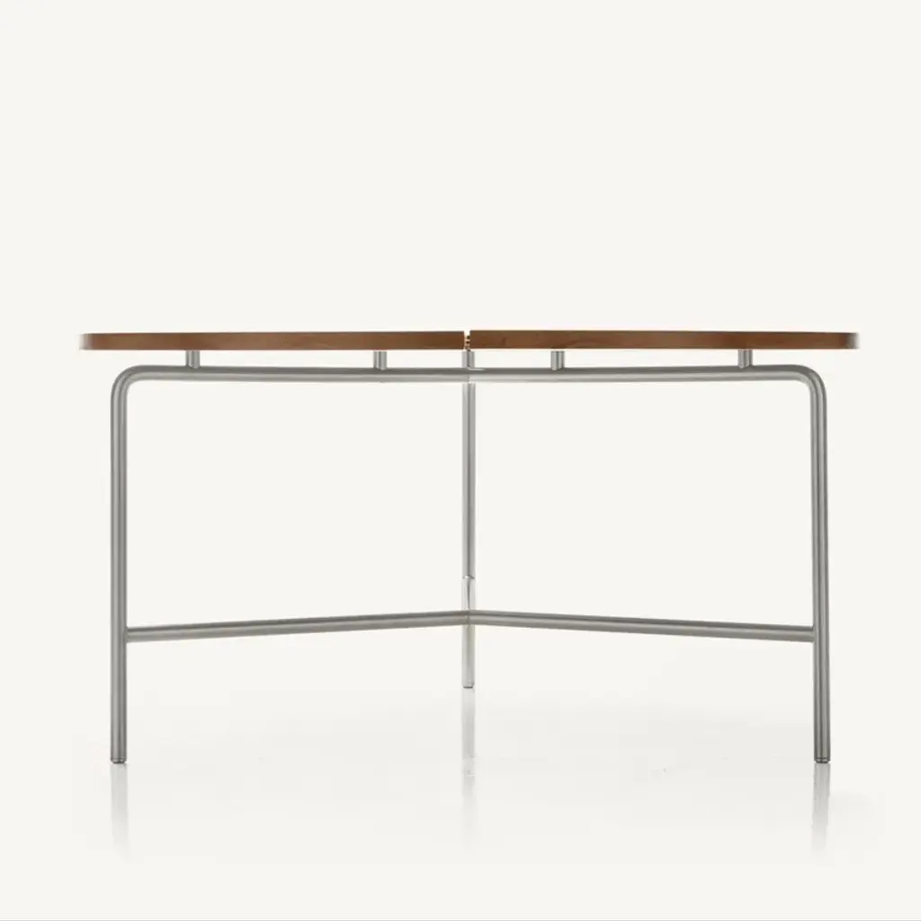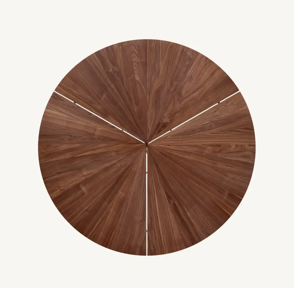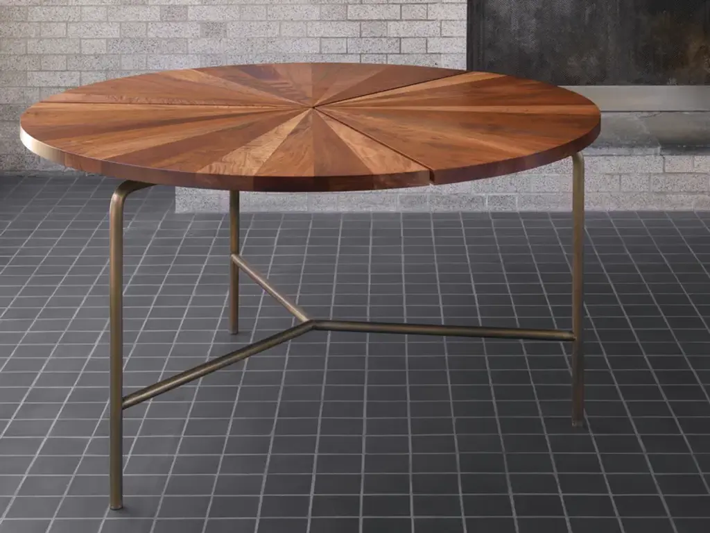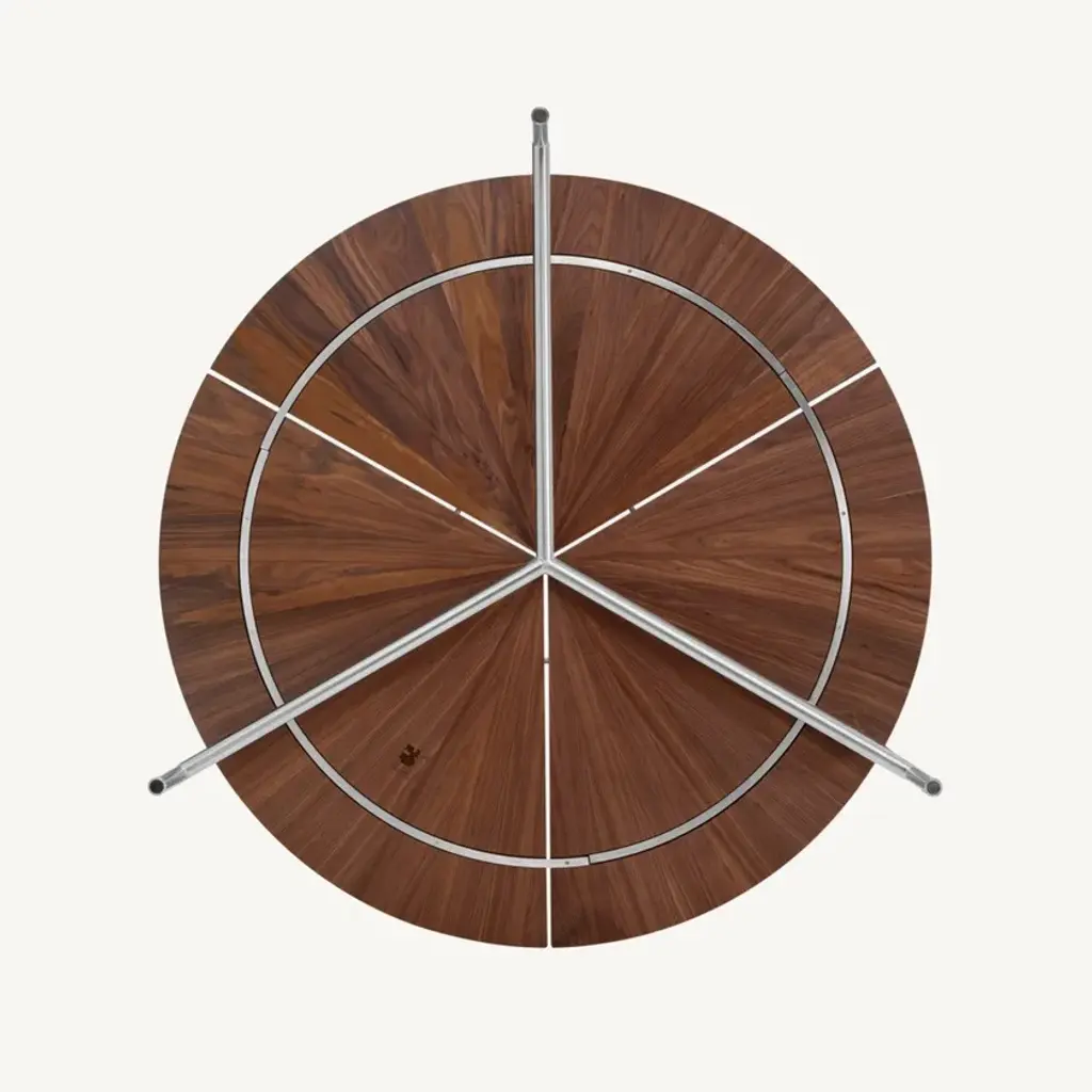 The Circular Dining Table is a solid wood dining/conference table with a base in solid brass, solid stainless steel, or nanoceramic coated solid stainless steel. The table can be used in covered outdoor environments in appropriate woods. Materials: Solid Walnut, Oak, Ash or Ebonized Ash. Base Options: Solid oxidized brass, solid stainless steel or Satin Nickel, Bronze, Satin Brass, or Gunmetal nanoceramic coated solid stainless steel.The Circular Table Collection marries pure geometry with high craft, resulting in a simple but elegant circle engineered in solid wood. Originally conceived as a durable everyday table that could be used both indoors and out, the smartly proportioned piece epitomizes BassamFellows contemporary ‘Craftsman Modern’ ethos. From above, the piece emanates a strong geometric identity given that the circle is divided equally into wedge shapes with the grain of the wood radiating from the center. The table top is cut into three equal segments separated by a reveal. The reveal allows the pie-shaped solid wood wedges to move freely with variations in humidity eliminating warping and splitting. A sturdy but agile floating presence is created by the table’s base, made from circular sections of tubular stainless steel. All joints are invisible. The tabletop is connected to the base with circular stanchions further adding to the table’s lightness. In Teak or Iroko, the table also works well in covered outdoor environments.