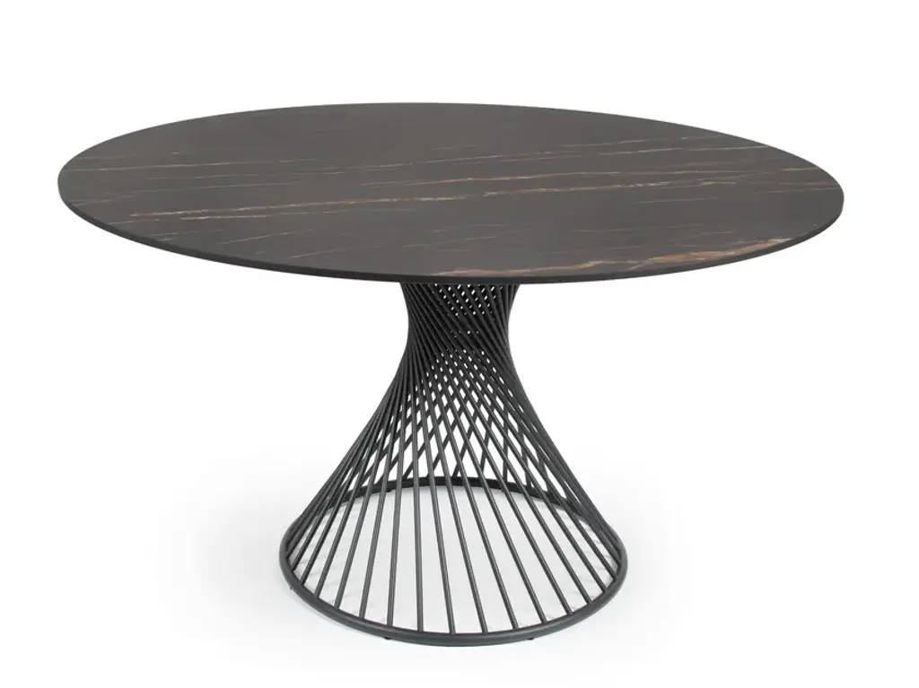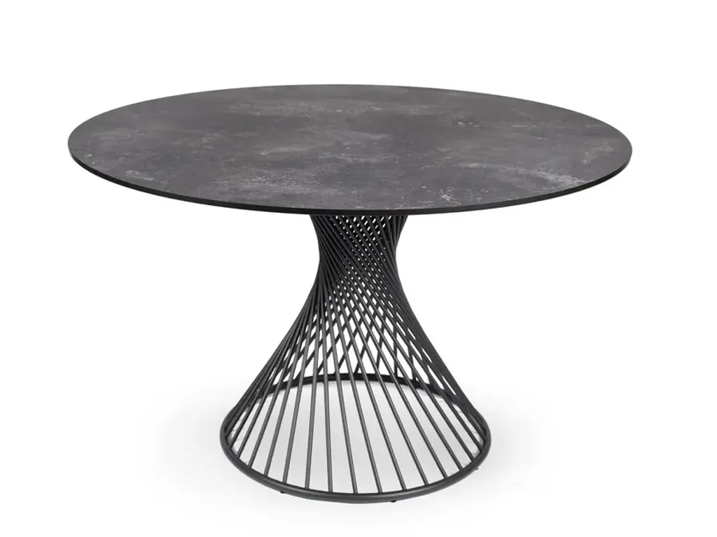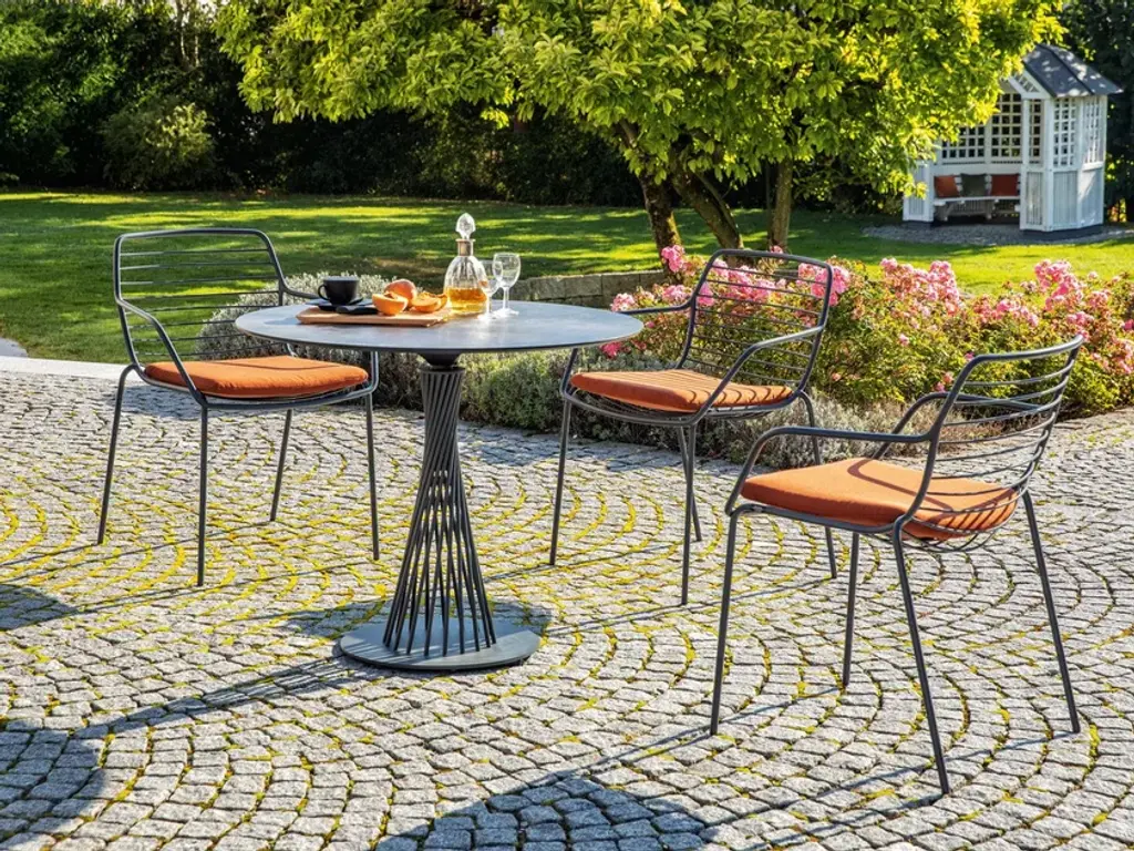 The CLARIS pedestal table with round tabletops is an icon as a table. A clear statement for the new design in the outdoor area. The long-term weather resistance of the masterpieces made exclusively from stainless steel goes without saying. Also new and elegant is the dark bronze color available alongside the classic anthracite. The table tops offered are made of weatherproof 12 mm porcelain ceramic with luxurious decors.The chair is a solitaire which, thanks to its clear shape, fits many of the tables on offer. The CLARIS tables are like sculptures with the unique design and are available in many sizes.