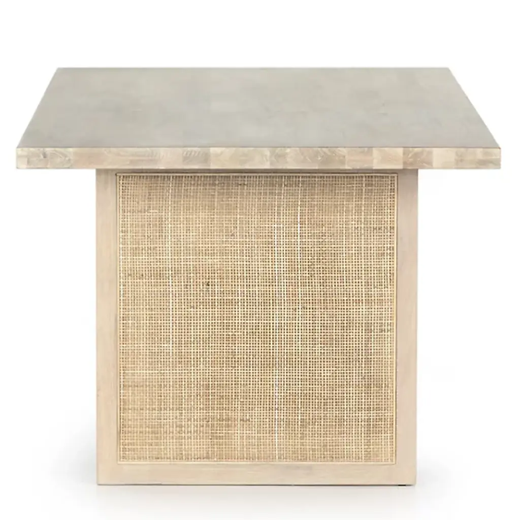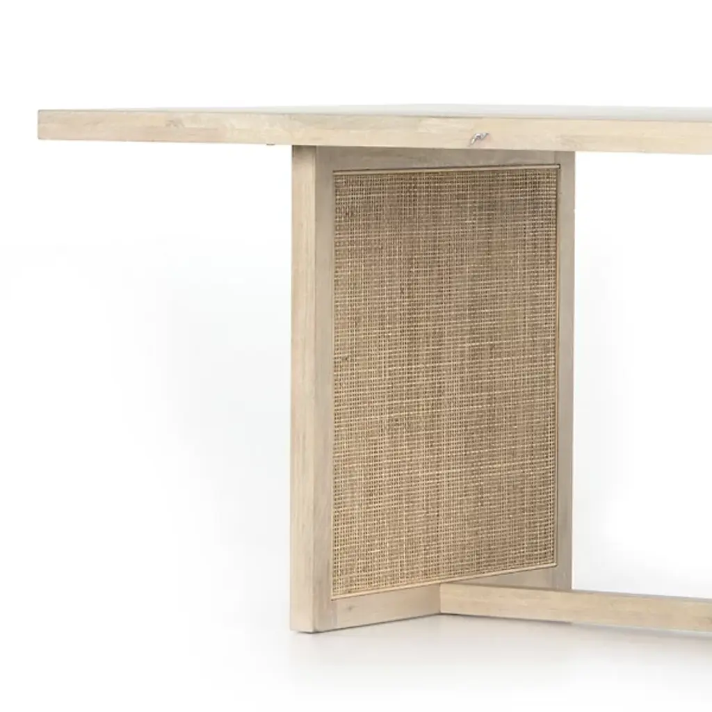 The Clarita Dining Table by Four Hands brings Bohemian style to your home décor. Clarita is a beautiful material blend. The frame of your table is composed of solid mango wood for durability. The rectangularly shaped legs of your table are lined with a lovely cane, which draws your gaze. Cane gives this decorative piece a textured, woven look. A crossbeam connects to each of this furnishment’s legs, keeping the cleanly designed tabletop properly balanced.