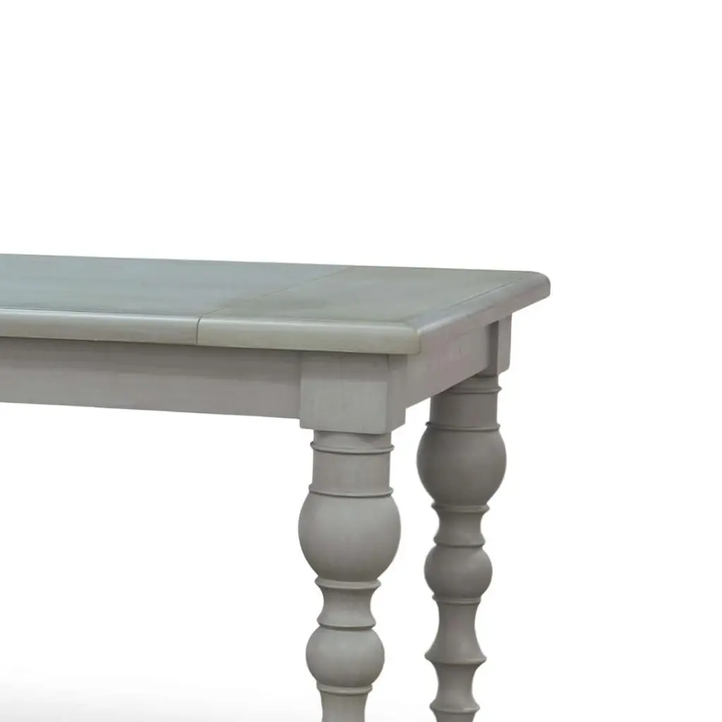 Crafted from solid mahogany, this table features a our Charleston Grey hand-painted finish, offering a subtle, yet striking rubbed distressed look that highlights its elegant craftsmanship.The grey finish complements a variety of interior styles, from rustic farmhouse to modern minimalist. The unusual turned and tapered legs add a unique touch, while the robust construction ensures it can handle everyday use and special occasions alike. Its generous size comfortably accommodates family and friends, making it the perfect centerpiece for any kitchen or dining room.Dimensions: 84" " W x 40" D x 30" H