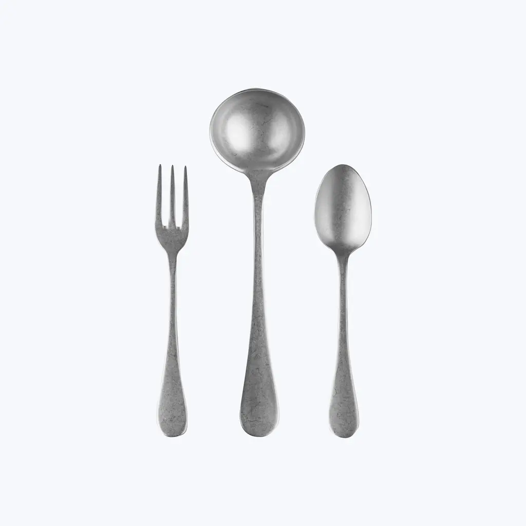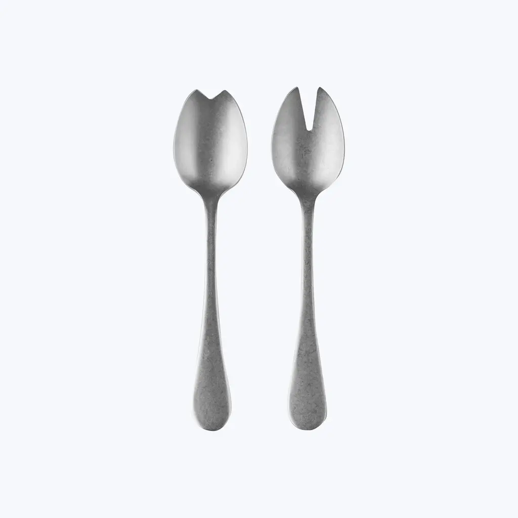 The Classic Vintage Serveware is made of the highest quality 18/10 stainless steel, 3 mm thick, very durable, and incredibly ergonomic for dinner parties and everyday use. The perfect balance between style and function, this high-quality Italian flatware brings elegance to the table without sacrificing functionality. Dishwasher and food safe. Created in 1947, Mepra is a family-owned and operated company with a worldwide presence in flatware, cookware, and stainless-steel products. Today, Mepra flatware and kitchenware appear on the tables of the most prestigious hotels, award-winning restaurants, and artisanal-centered homes. Bring the magic of three generations worth of Italian traditions, designs, and lifestyles into your kitchen and dining room today. Stainless Steel plating features a special vintage process that gives it a rustic, warm, and elegant appearance while still being durable and inoxidizable coating. Serving Set includes (1) Serving Fork, (1) Serving Spoon
