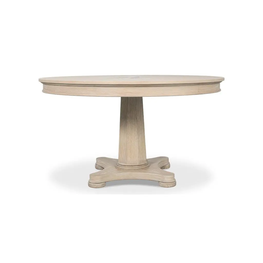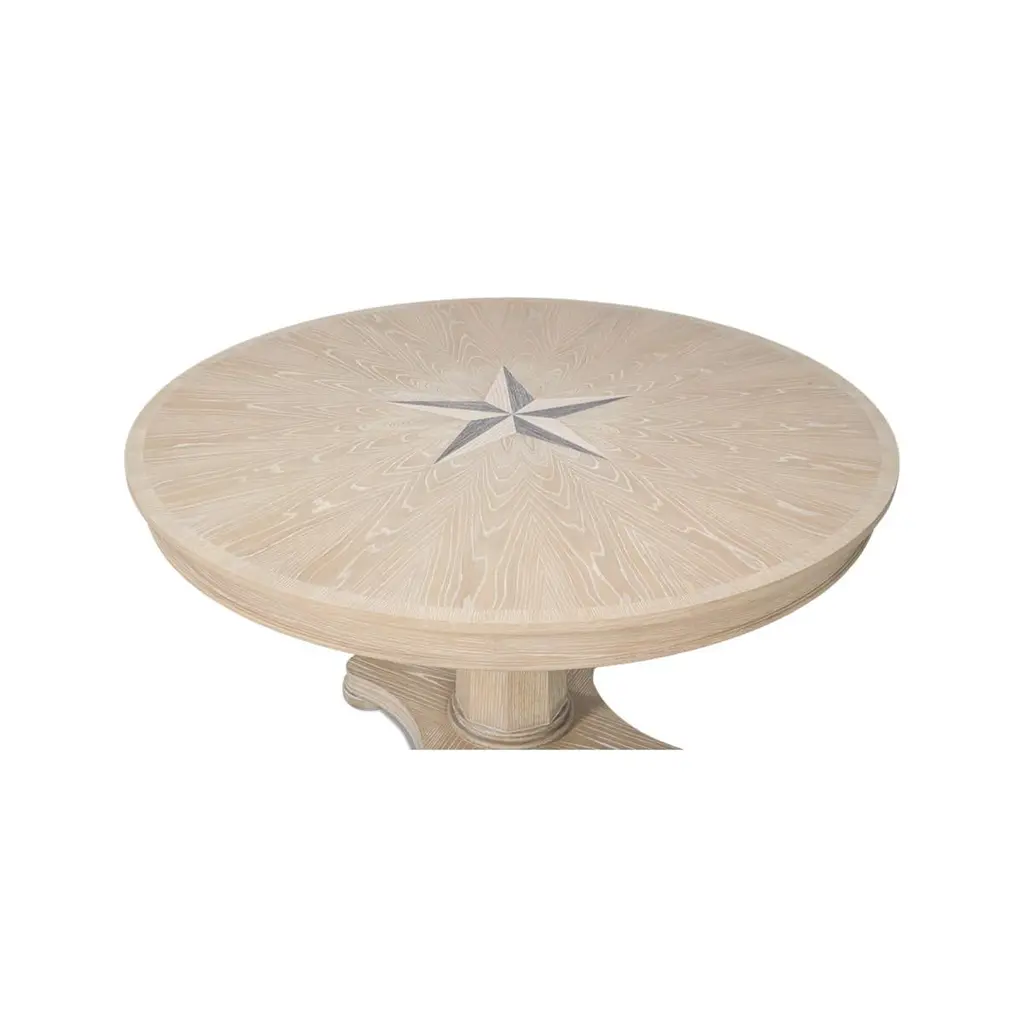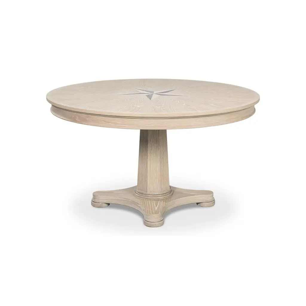 This stunning round oak table is a showcase of craftsmanship and elegance. Designed with a classical touch, the table features a beautiful nautical mariner starburst inlay at the center, creating a compelling focal point that draws the eye. The soft, whitewashed finish highlights the natural grain of the wood, giving it a rustic yet refined look.A 21st-century update to a classic English Regency table, it stands on a sturdy, central pedestal base that offers a solid foundation and ample legroom.With its circular shape, this table is ideal for fostering conversation, making it perfect for intimate dinners or small gatherings. Its versatile aesthetic allows it to blend seamlessly with a variety of interior designs, from farmhouse chic to coastal or traditional decors.Dimensions: 54" W x 54" D x 30" H