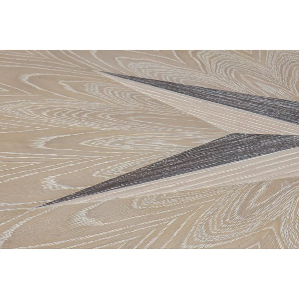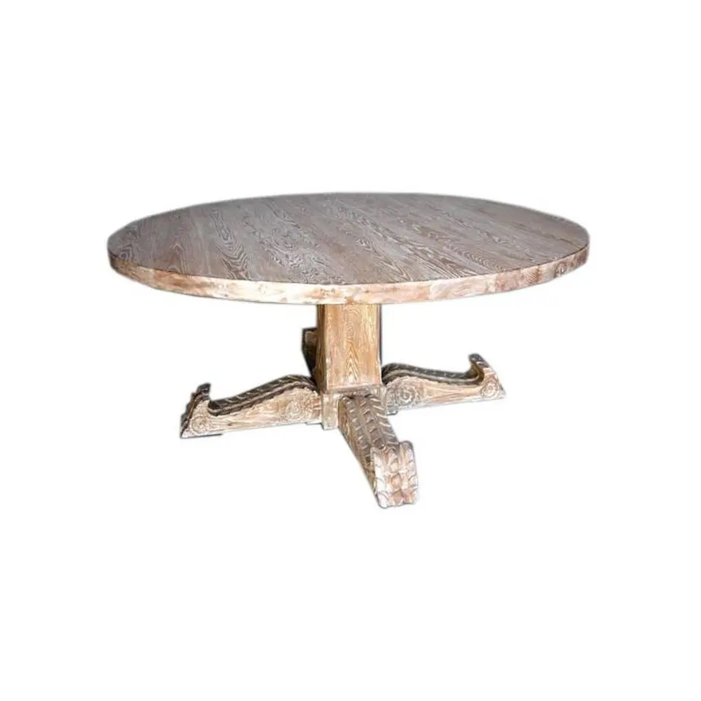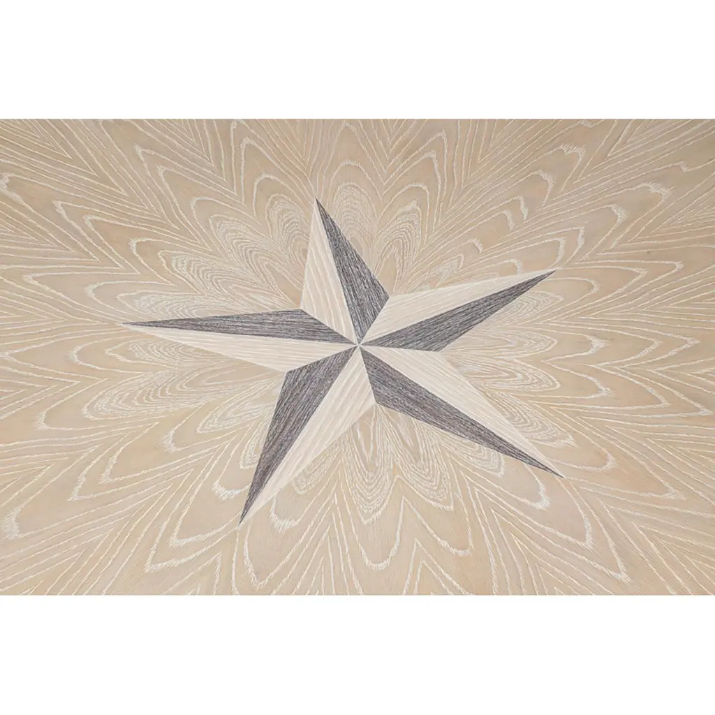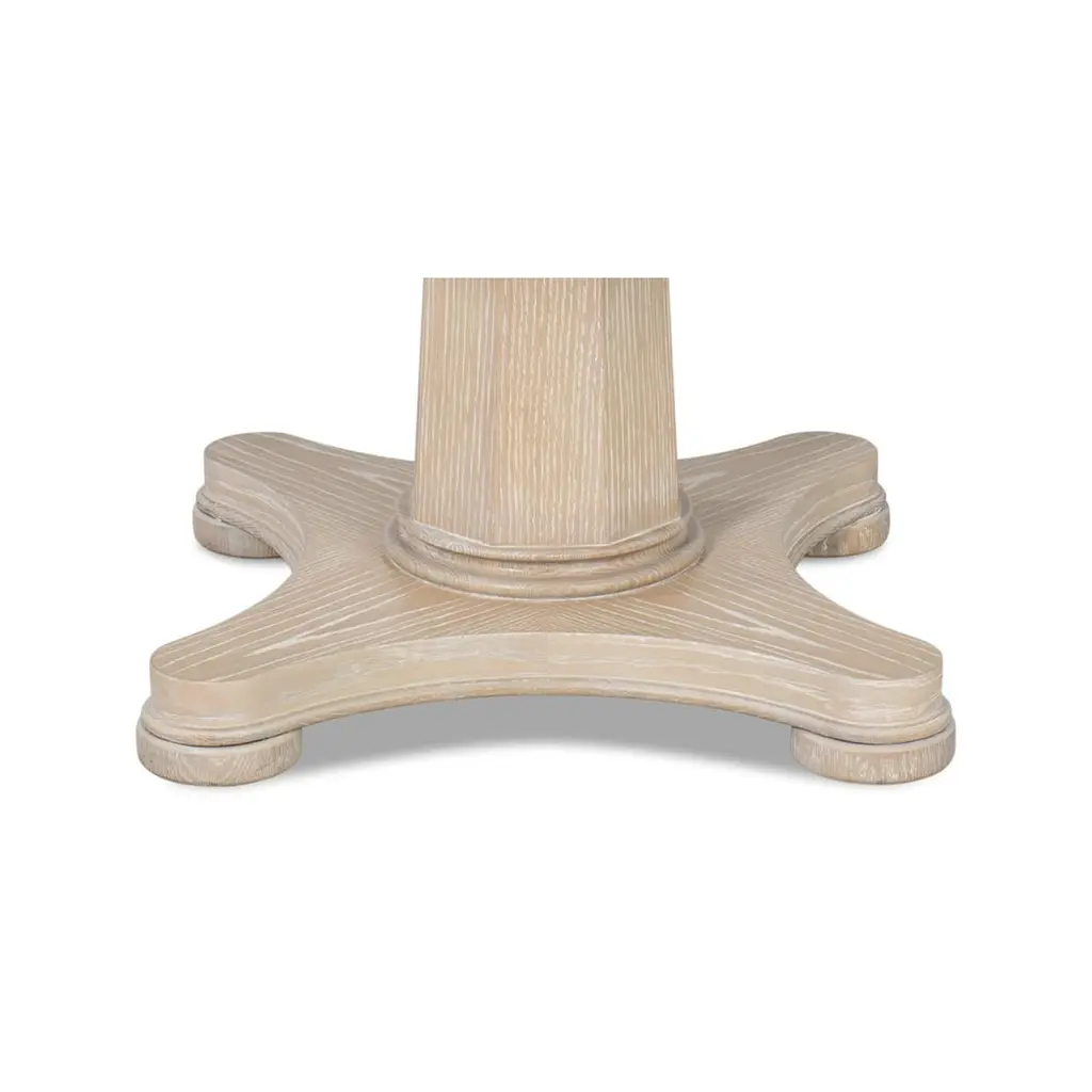 This stunning round oak table is a showcase of craftsmanship and elegance. Designed with a classical touch, the table features a beautiful nautical mariner starburst inlay at the center, creating a compelling focal point that draws the eye. The soft, whitewashed finish highlights the natural grain of the wood, giving it a rustic yet refined look.A 21st-century update to a classic English Regency table, it stands on a sturdy, central pedestal base that offers a solid foundation and ample legroom.With its circular shape, this table is ideal for fostering conversation, making it perfect for intimate dinners or small gatherings. Its versatile aesthetic allows it to blend seamlessly with a variety of interior designs, from farmhouse chic to coastal or traditional decors.Dimensions: 54" W x 54" D x 30" H
