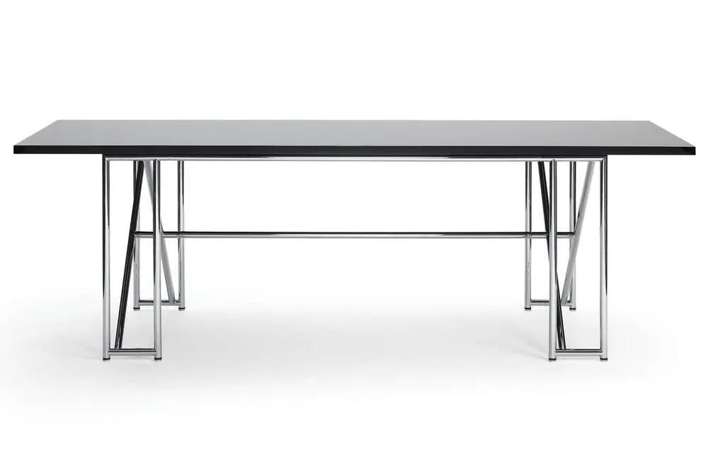 When an avant-garde steel tube design meets the classical refectory table, the result is the double X. A large, yet elegant table, its X-shaped supports make for optimum rigidity. Like so many of Eileen Gray‘s designs, the double X is a master of many roles, cutting a fine figure both as a dining room table and as a desk or office table for individualists.Frame of chromium-plated steel tubing. Table-top in crystal glass.Dimensions: W 225 x 110cm, H 73 cm. 88.5" x 43.3" x 28.75" H.